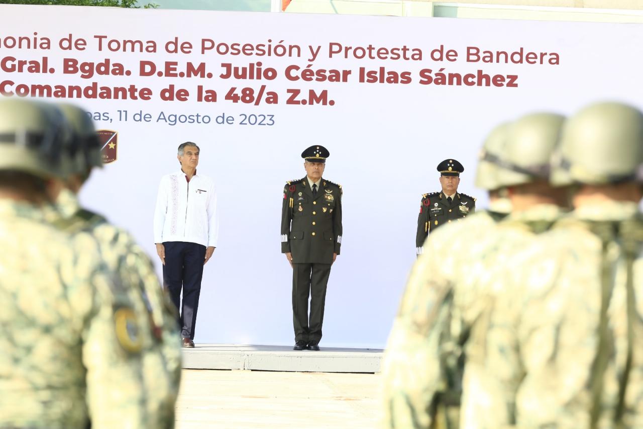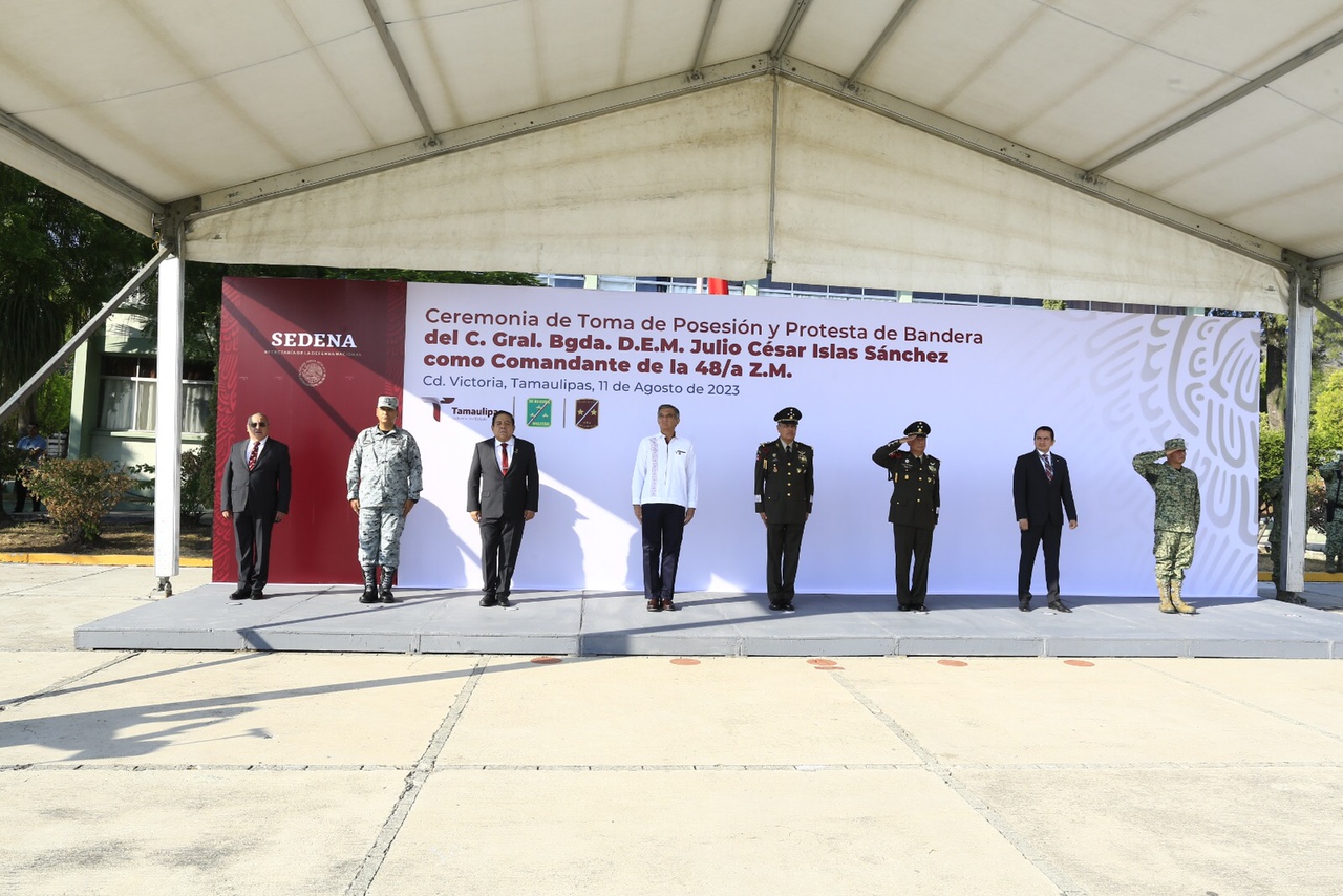 Ciudad Victoria, Tamaulipas.- El gobernador Américo Villarreal Anaya asistió a la toma de posesión y protesta de bandera del general de brigada Diplomado de Estado Mayor, Julio César Islas Sánchez como nuevo comandante de la 48/a Zona Militar, la cual cubre 28 municipios de Tamaulipas.