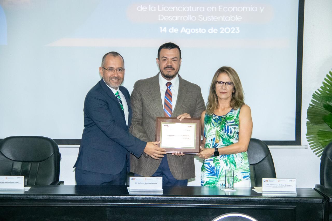Como producto del trabajo de mejora continua que impulsa el C. P. Guillermo Mendoza Cavazos, rector de la Universidad Autónoma de Tamaulipas (UAT), se llevó a cabo la entrega del reconocimiento que acredita a nivel nacional la calidad de la Licenciatura en Economía y Desarrollo Sustentable que imparte la máxima casa de estudios del estado.