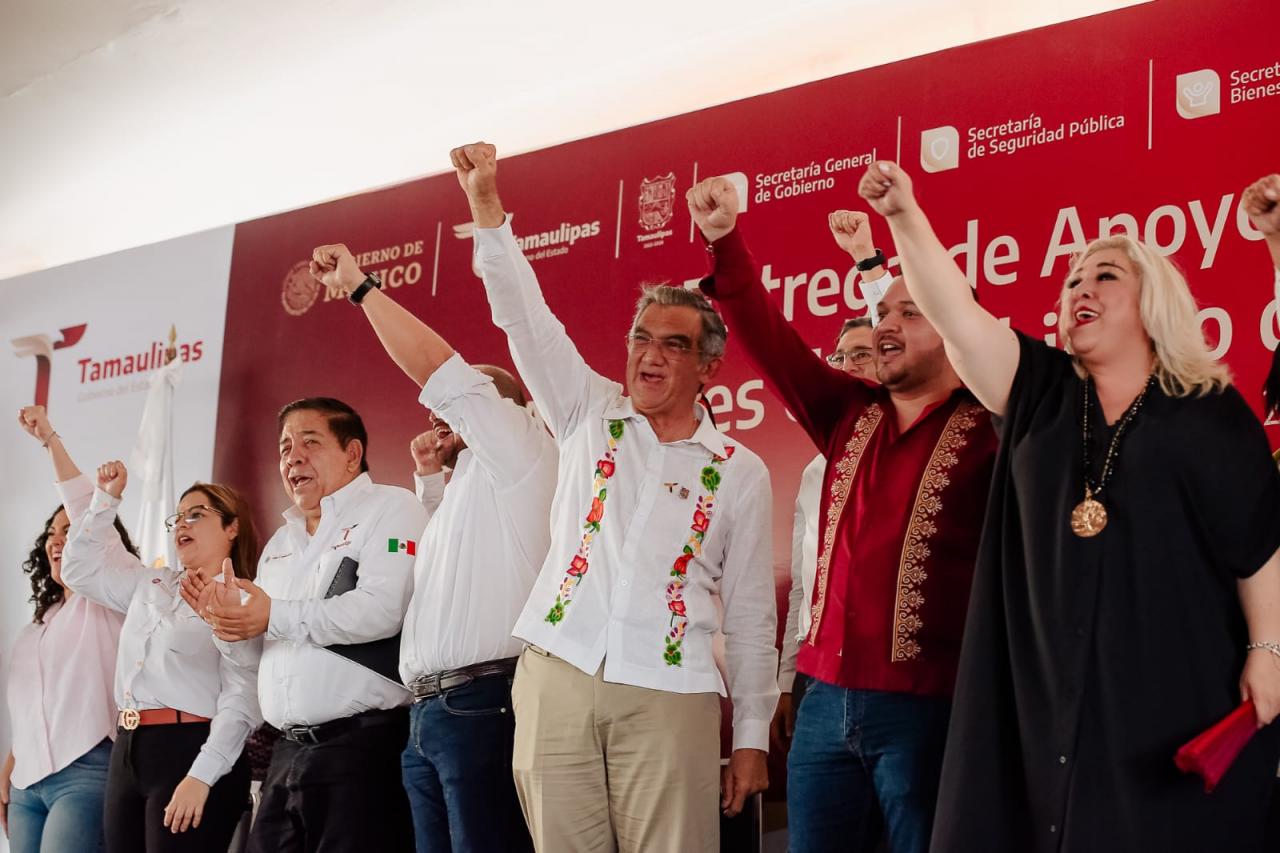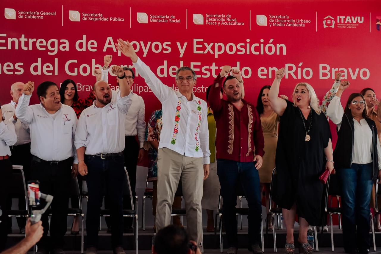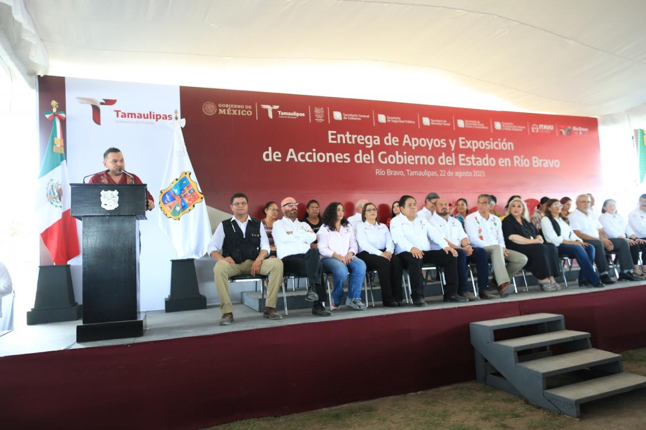 Río Bravo, Tamaulipas. - En el marco de la entrega de apoyos en beneficio de familias de Río Bravo y Valle Hermoso, el gobernador Américo Villarreal Anaya dio instrucciones precisas para que a partir de mañana se refuerce la seguridad de los trabajadores en la brecha 109 de este municipio y anunció nuevas inversiones en obra pública, rehabilitación de escuelas, un gimnasio deportivo y equipo para el mejoramiento de los servicios públicos.