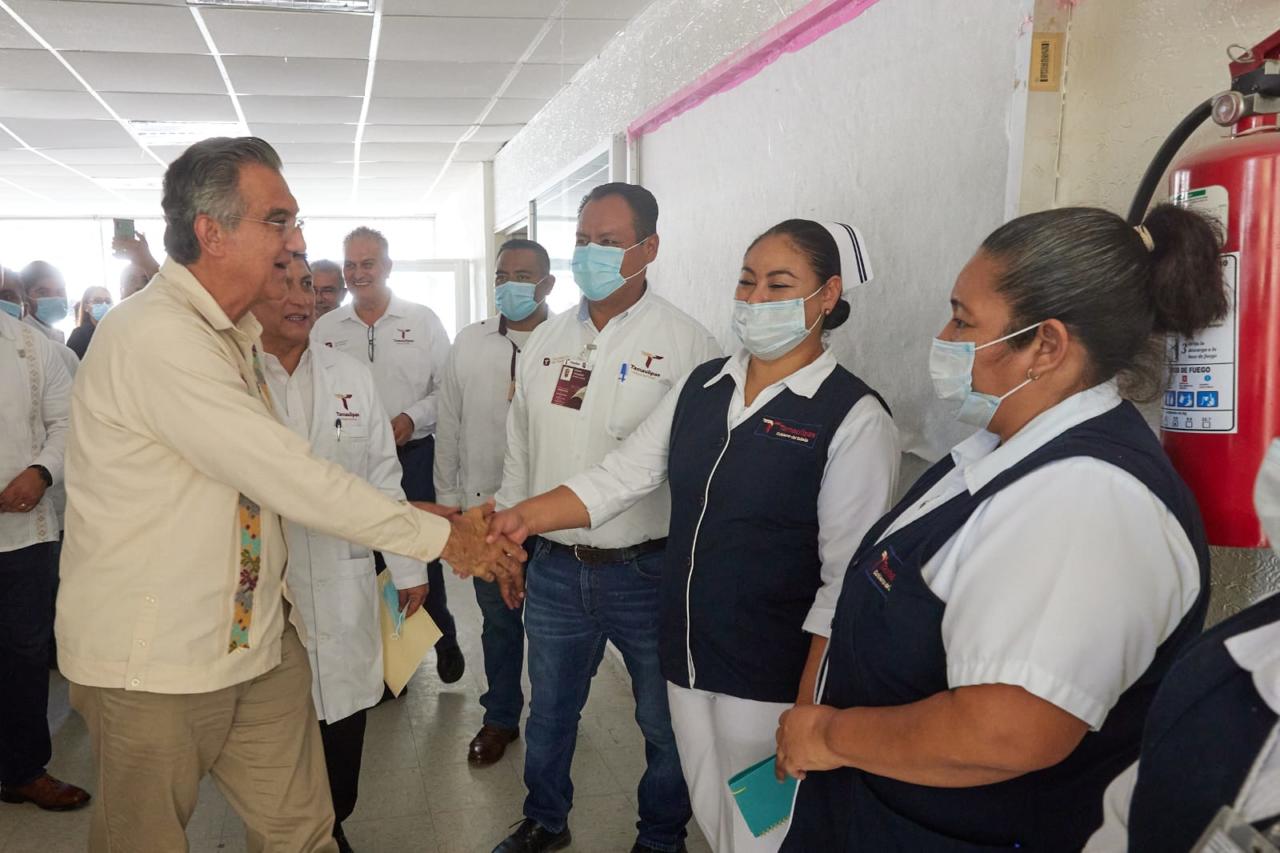 En un amplio recorrido por las áreas de medicina interna, traumatología, cirugía, pediatría, ginecología, dental y laboratorio y tras dialogar con personal médico, de enfermería y pacientes, Américo Villarreal entregó equipo nuevo y se comprometió a atender las peticiones que se le plantearon; "hay que renovarlo", dijo tras ver la placa de inauguración del hospital en abril de 1980.