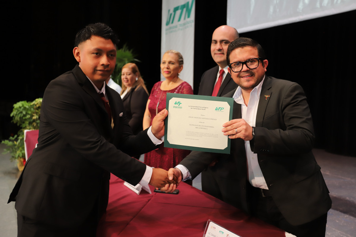 Más de 450 estudiantes de las carreras de Administración, Mecatrónica, Procesos Industriales, Energías Renovables y de la Maestría en Ingeniería Industrial en Manufactura Avanzada recibieron su título profesional, acompañados por familiares y amistades en esta relevante actividad académica.