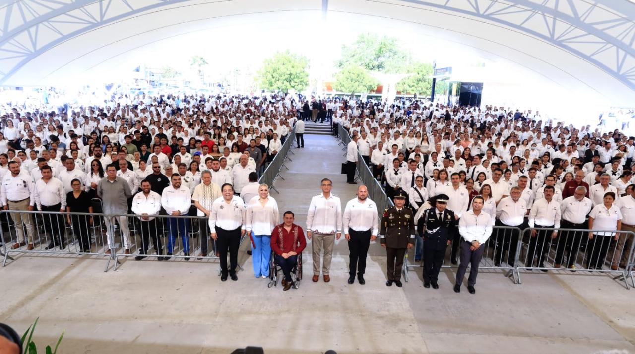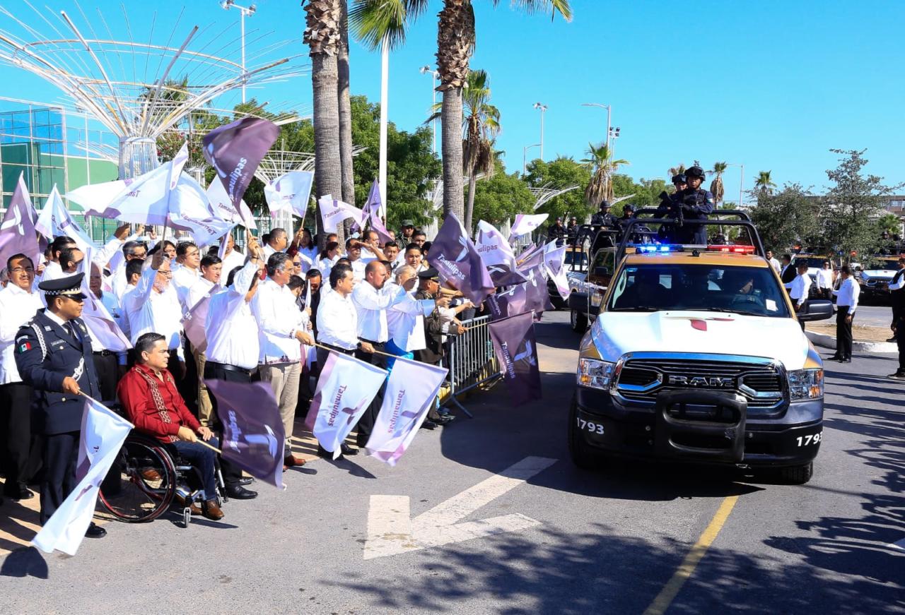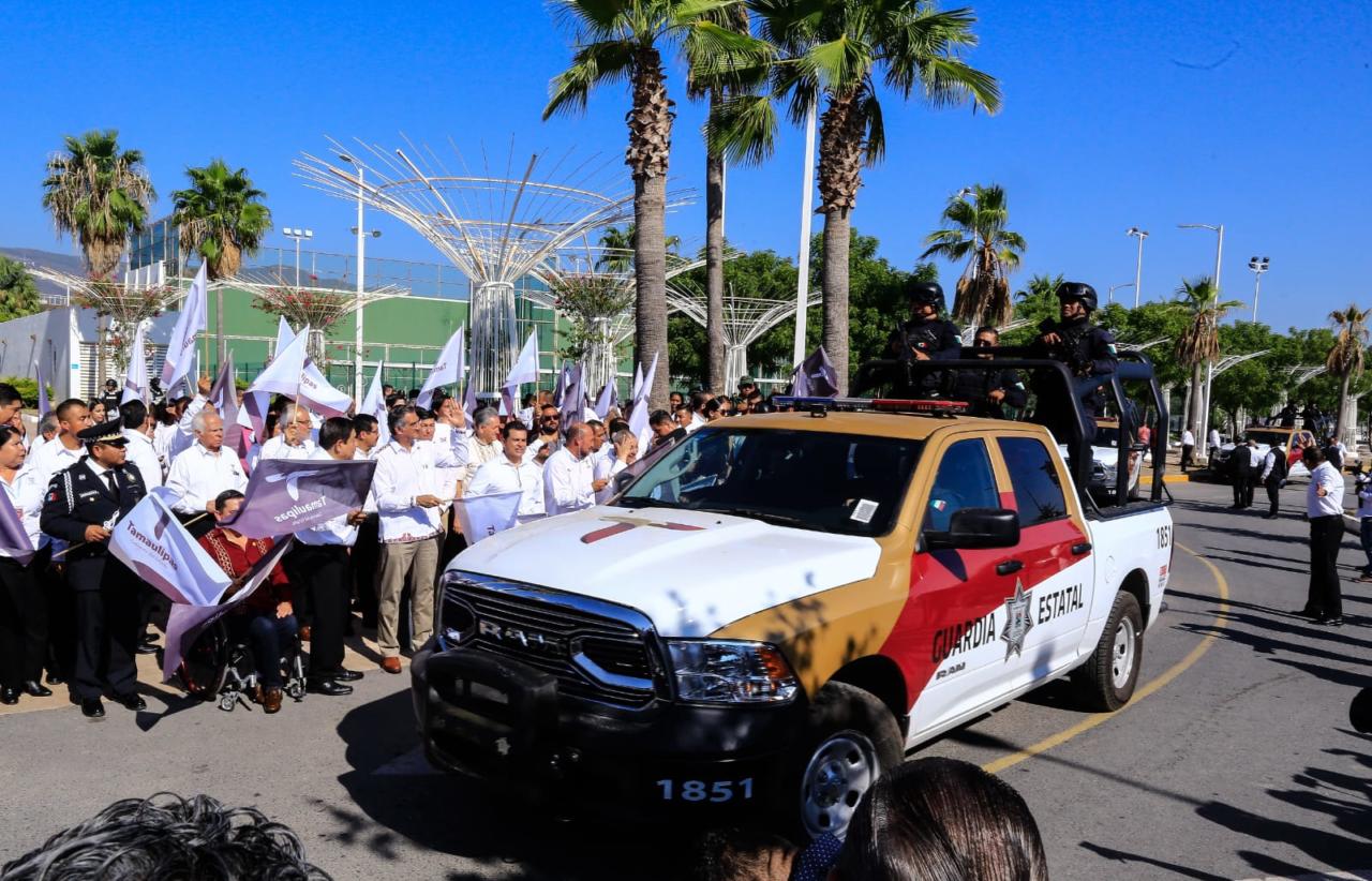 Luego de presidir la ceremonia cívica de honores, en la Unidad Deportiva Adolfo Ruiz Cortines, el gobernador acompañado por el secretario de Seguridad Pública y representantes de las Fuerzas Armadas, se trasladó a la explanada del complejo deportivo en donde dio el banderazo de salida a las cien nuevas patrullas.
