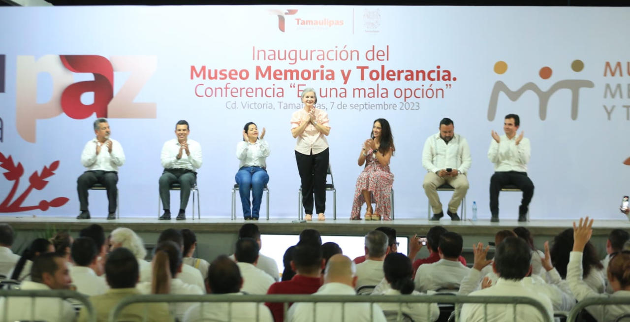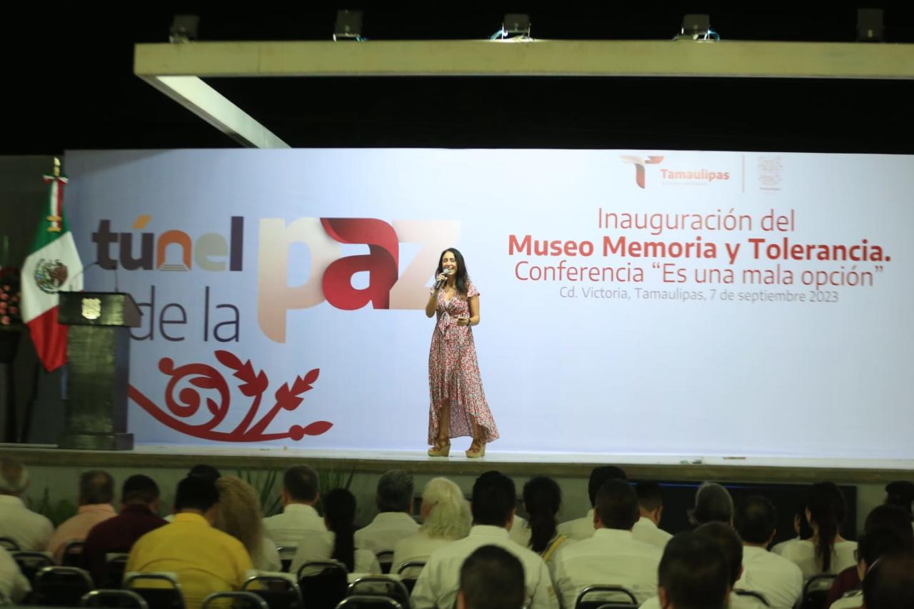 Por su parte, la coordinadora del Museo Memoria y Tolerancia, Pola Salmún, agradeció al Gobierno de Tamaulipas, la disposición para presentar la exhibición del Túnel de la Paz, que estará en 12 municipios y que incluye conferencias virtuales para hablar de tolerancia, inclusión, diversidad y los derechos humanos en México; además brindó una conferencia denominada “Es una mala opción”.