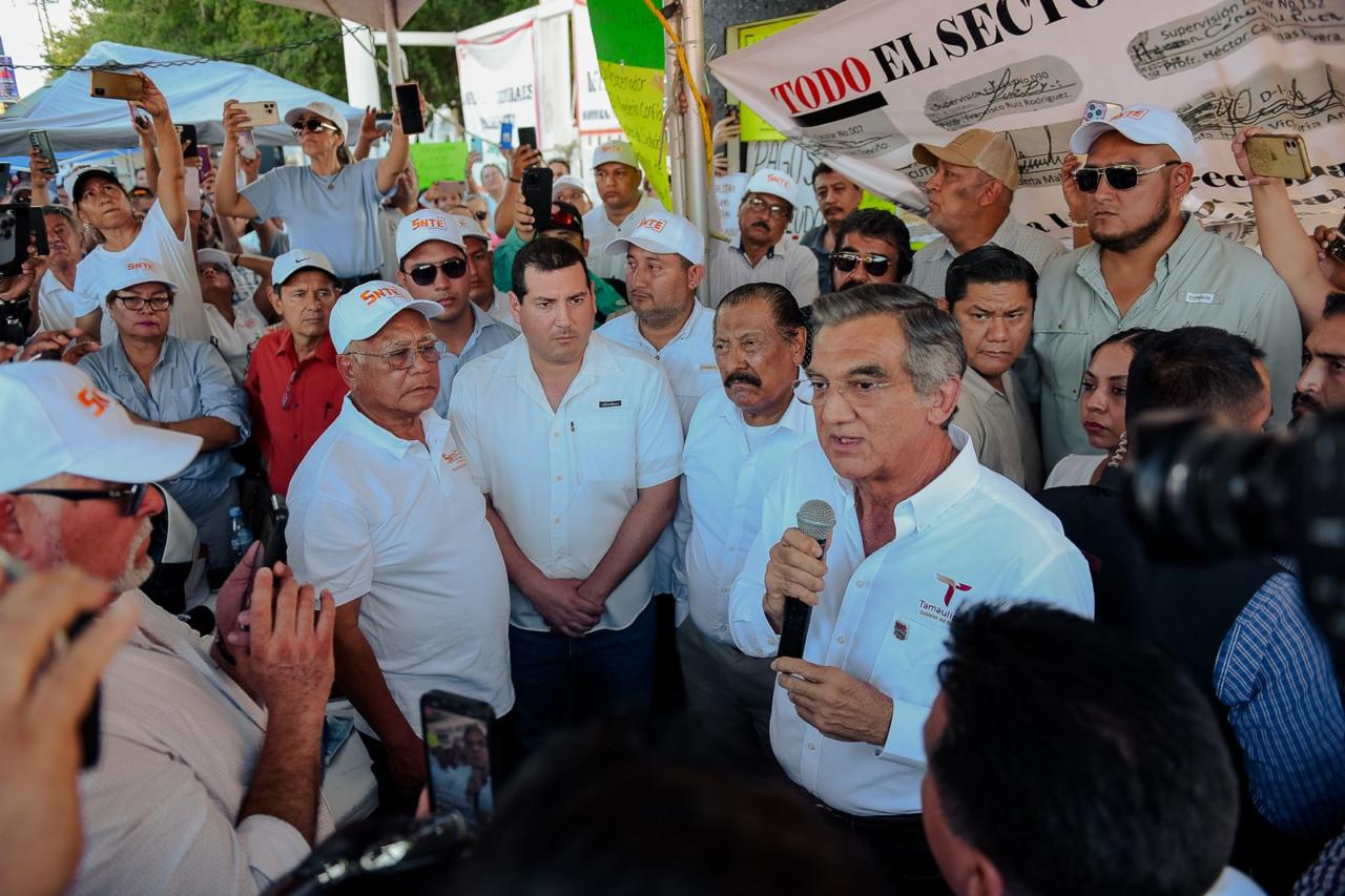Ciudad Victoria, Tamaulipas.- El gobernador Américo Villarreal Anaya acudió la tarde de este lunes al plantón de las y los maestros y les dijo que está abierto al diálogo y a resolver sus demandas; los invitó a volver a clases por respeto a la niñez, y les aclaró que su gobierno es humanista, que no amenaza ni persigue como la administración anterior.