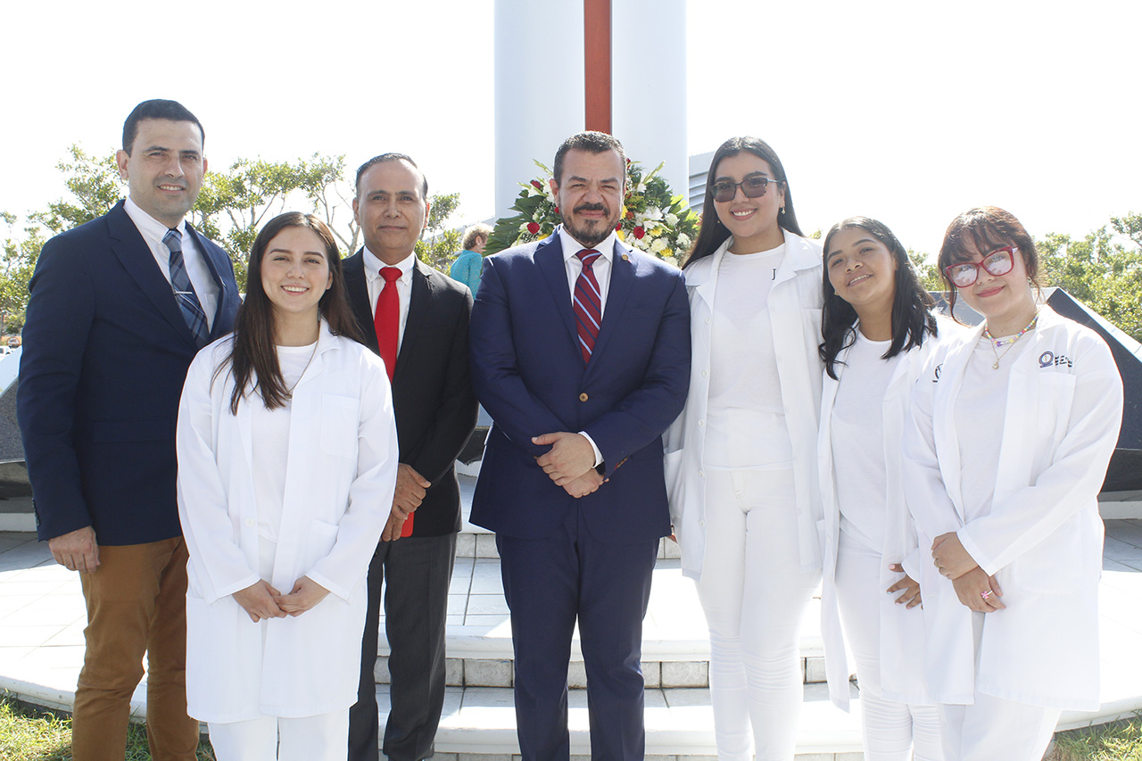 Como parte del protocolo, el C. P. Guillermo Mendoza Cavazos realizó la guardia de honor y colocó una ofrenda floral, acompañado de la Mtra. Elda Ruth de los Reyes Villarreal, directora de la Facultad de Derecho y Ciencias Sociales (FADYCS); y del Dr. Raúl de León Escobedo, director de la Facultad de Medicina de Tampico.