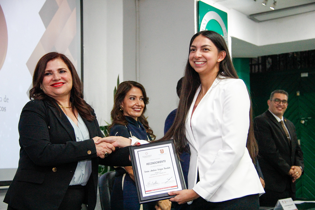 Se entregó también reconocimiento al C. P. Jorge Luis Galeana Zapién como Profesor Distinguido 2023, así como a los alumnos Denis Andrea Vargas Bautista y Juan Carlos Guevara Gutiérrez por obtener los más altos promedios de la licenciatura en la FCAV.