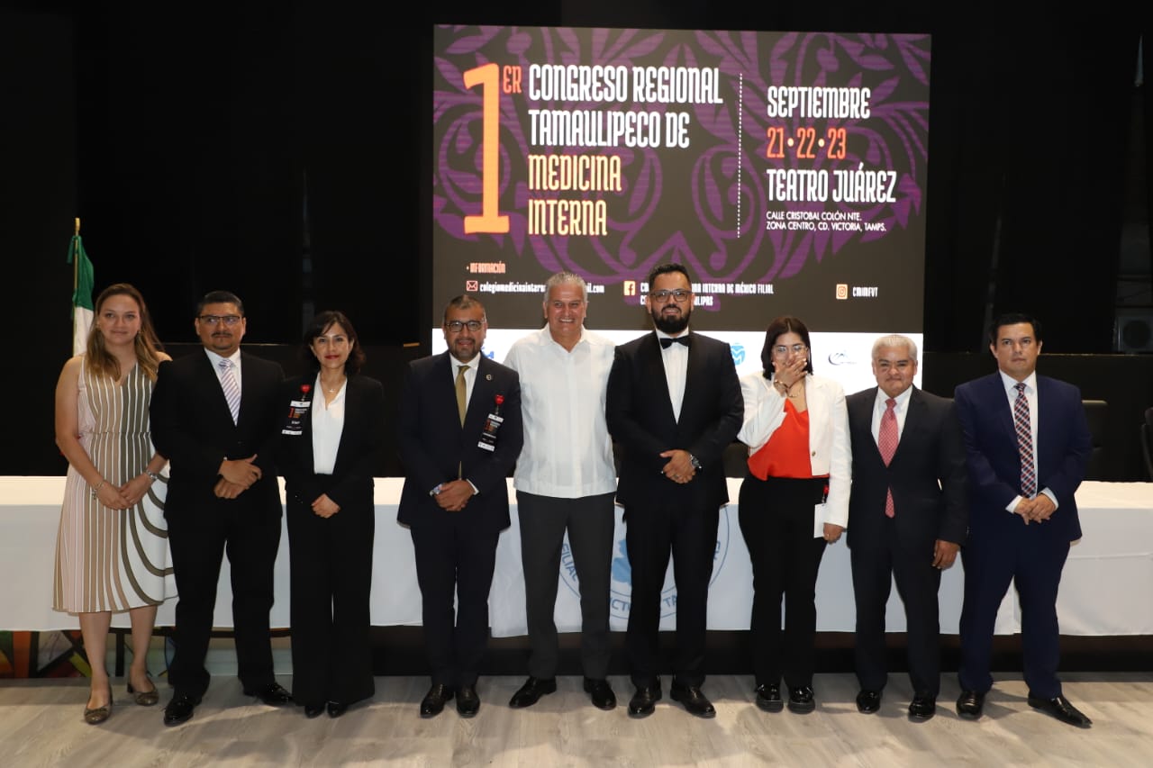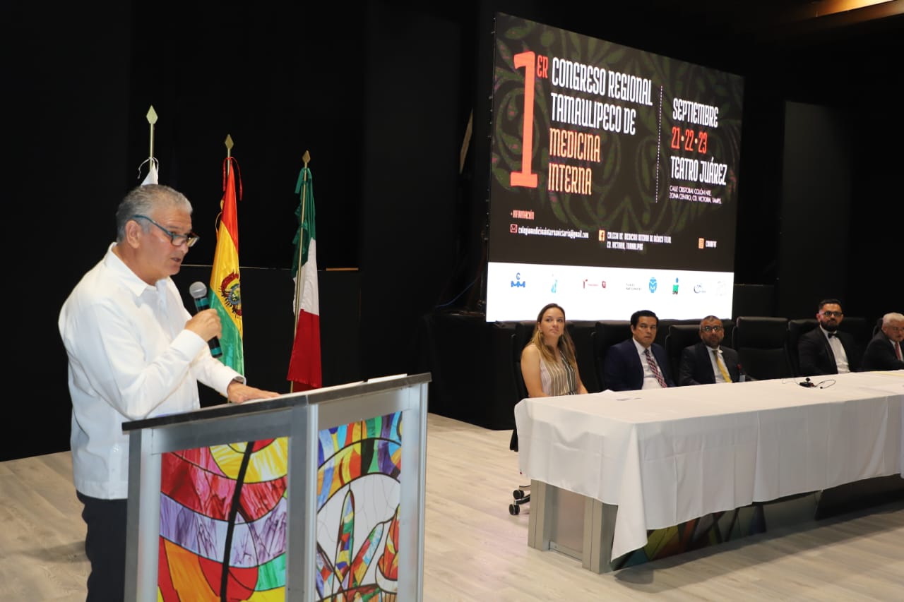 Ciudad Victoria, Tamaulipas.- En un espacio en donde se une la excelencia médica y el trato humano hacia los pacientes, en representación del gobernador Américo Villarreal Anaya, el secretario de Salud, Vicente Joel Hernández Navarro, inauguró los trabajos del Primer “Congreso Regional Tamaulipeco de Medicina Interna”.