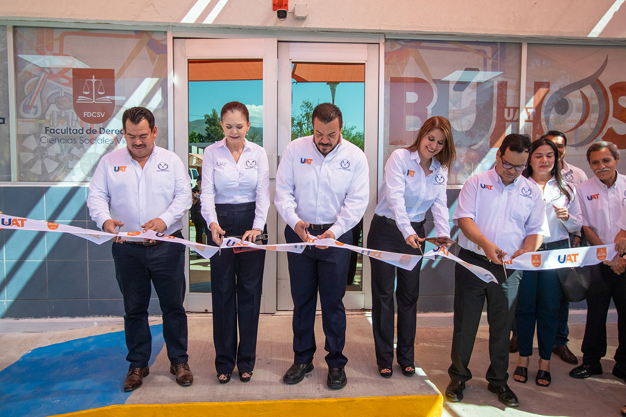 El C. P. Guillermo Mendoza Cavazos, rector de la Universidad Autónoma de Tamaulipas (UAT), visitó la Facultad de Derecho y Ciencias Sociales Victoria (FDCSV), donde entregó equipo de cómputo, inauguró la remodelación de diversas áreas y puso en marcha nueva infraestructura que fortalecerá los servicios educativos de este plantel universitario.