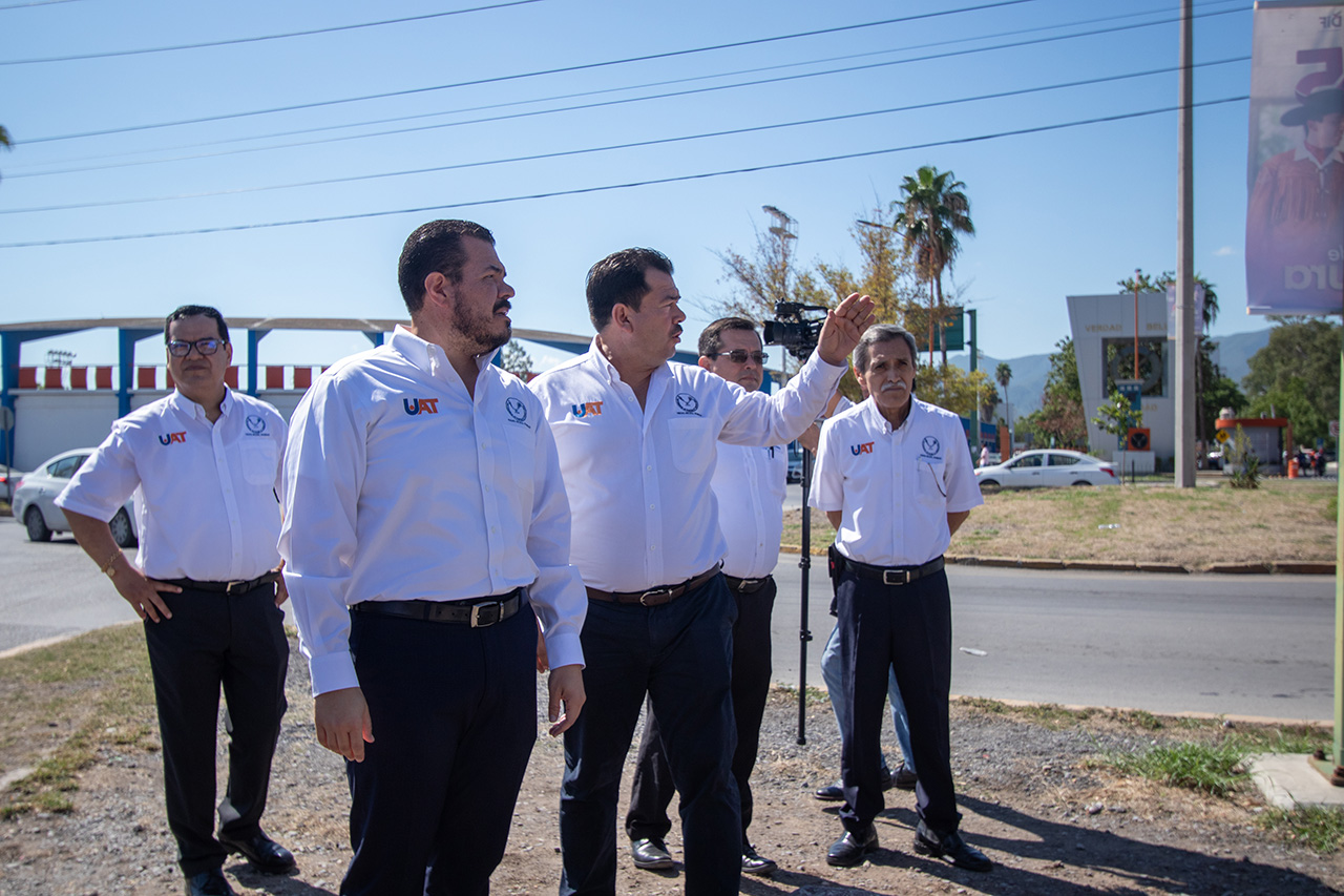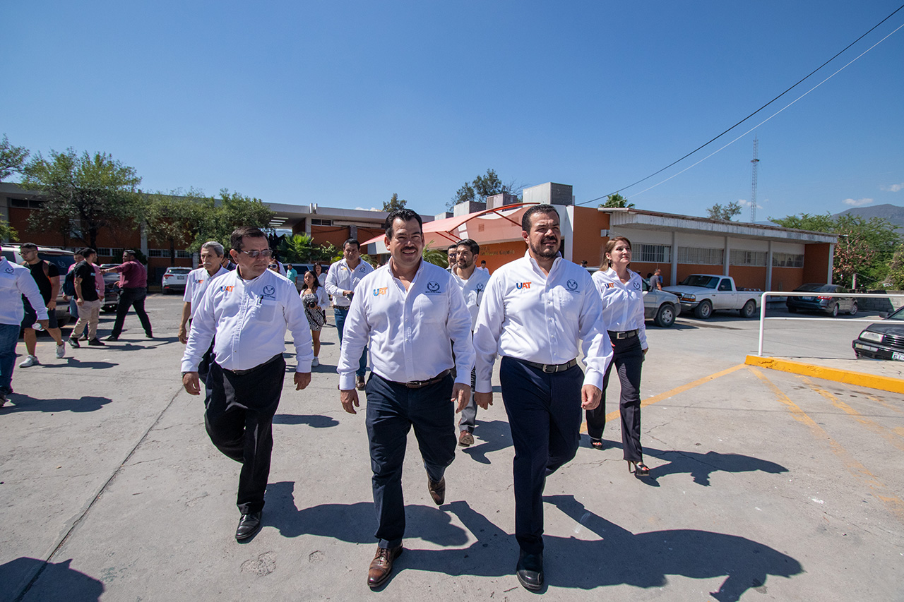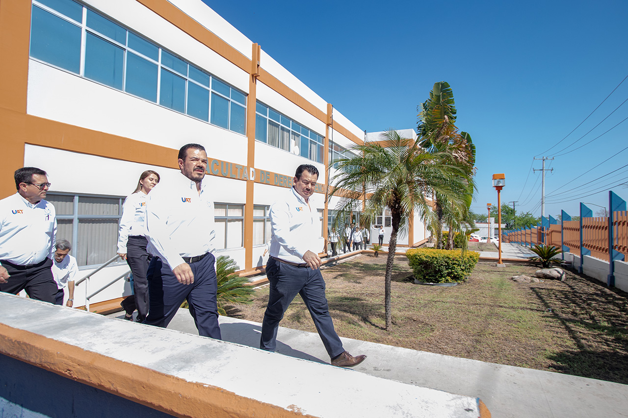 La visita del máximo directivo de la UAT inició frente a las instalaciones de la Facultad de Derecho Victoria, donde constató el proyecto de mejoramiento de la fachada; posteriormente, se dirigió al centro de cómputo para entregar treinta y ocho nuevas computadoras al servicio del alumnado.