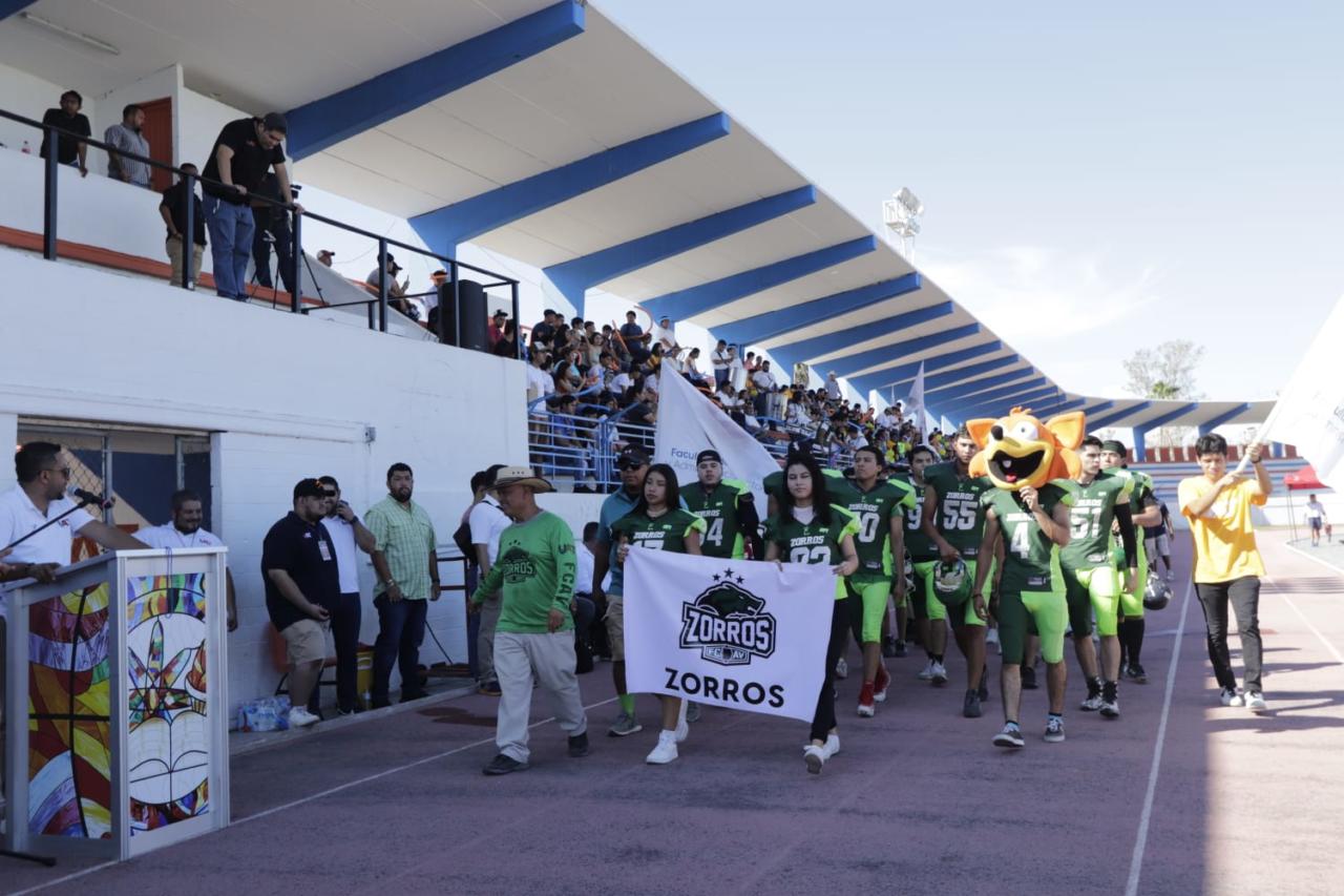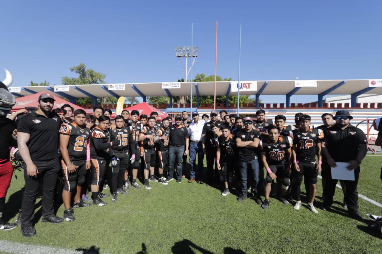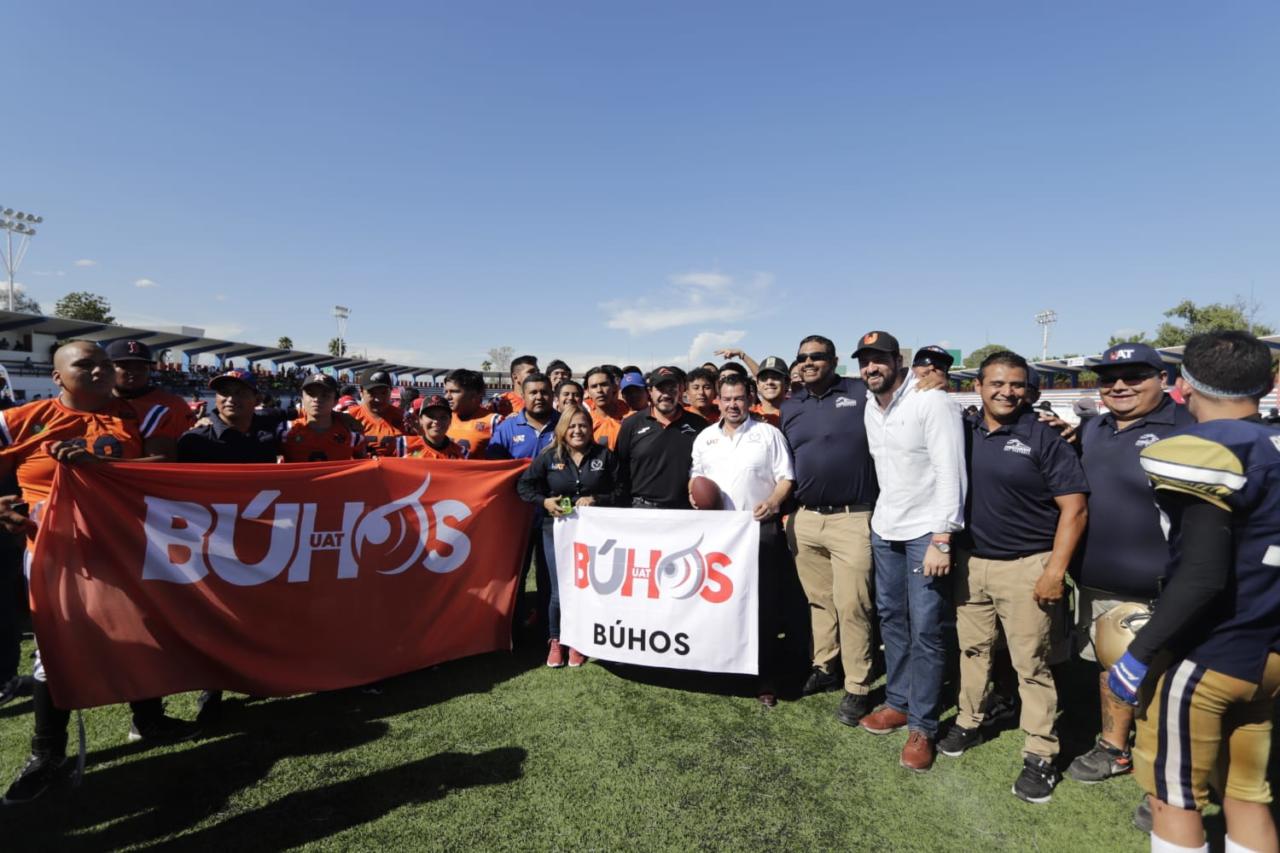 Acompañado por titulares de las diferentes facultades y unidades académicas de la UAT, el rector se trasladó al centro del campo para dar la patada inicial del torneo y del encuentro inaugural entre los Cuernos Largos de la Facultad de Medicina Veterinaria y Zootecnia y los Vaqueros de la Facultad de Ingeniería y Ciencias.