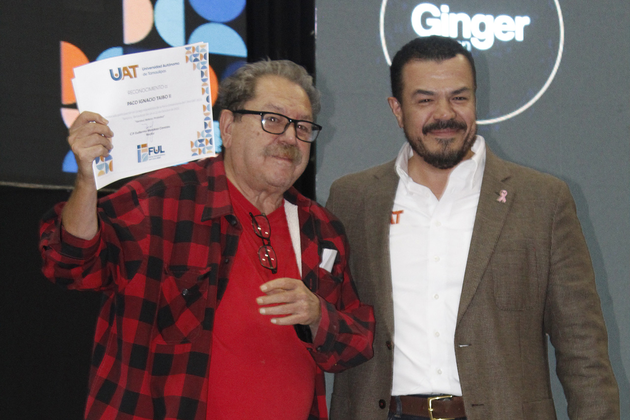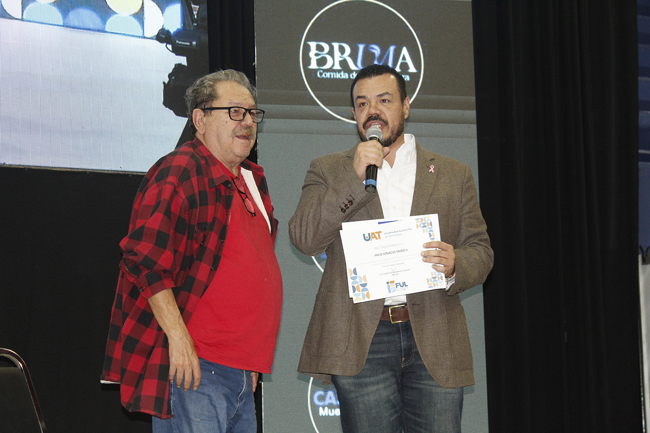 En su oportunidad, el rector C.P. Guillermo Mendoza Cavazos le entregó un reconocimiento a Paco Ignacio Taibo II, y le agradeció el apoyo que ha dado el Fondo de Cultura Económica para la realización de este foro que se inició en Tampico y se ha extendido a Nuevo Laredo, Reynosa y Ciudad Victoria.