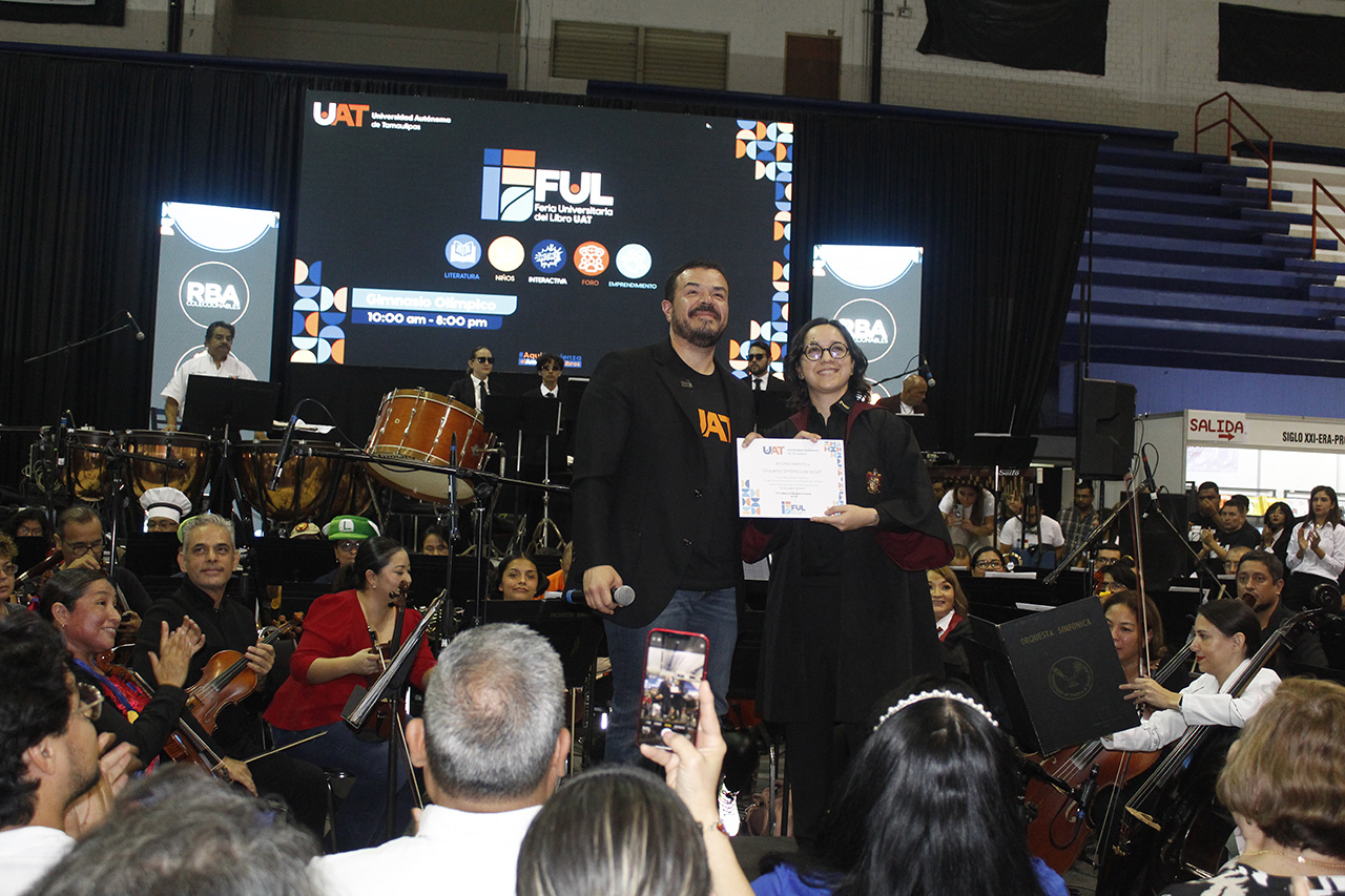 El C.P. Guillermo Mendoza Cavazos, rector de la Universidad Autónoma de Tamaulipas, presidió la ceremonia de clausura de la Feria Universitaria del Libro 2023 (FUL UAT), evento que tuvo como marco un extraordinario concierto presentado por la Orquesta Sinfónica (OSUAT) en el Gimnasio Olímpico del Centro Universitario de Tampico.