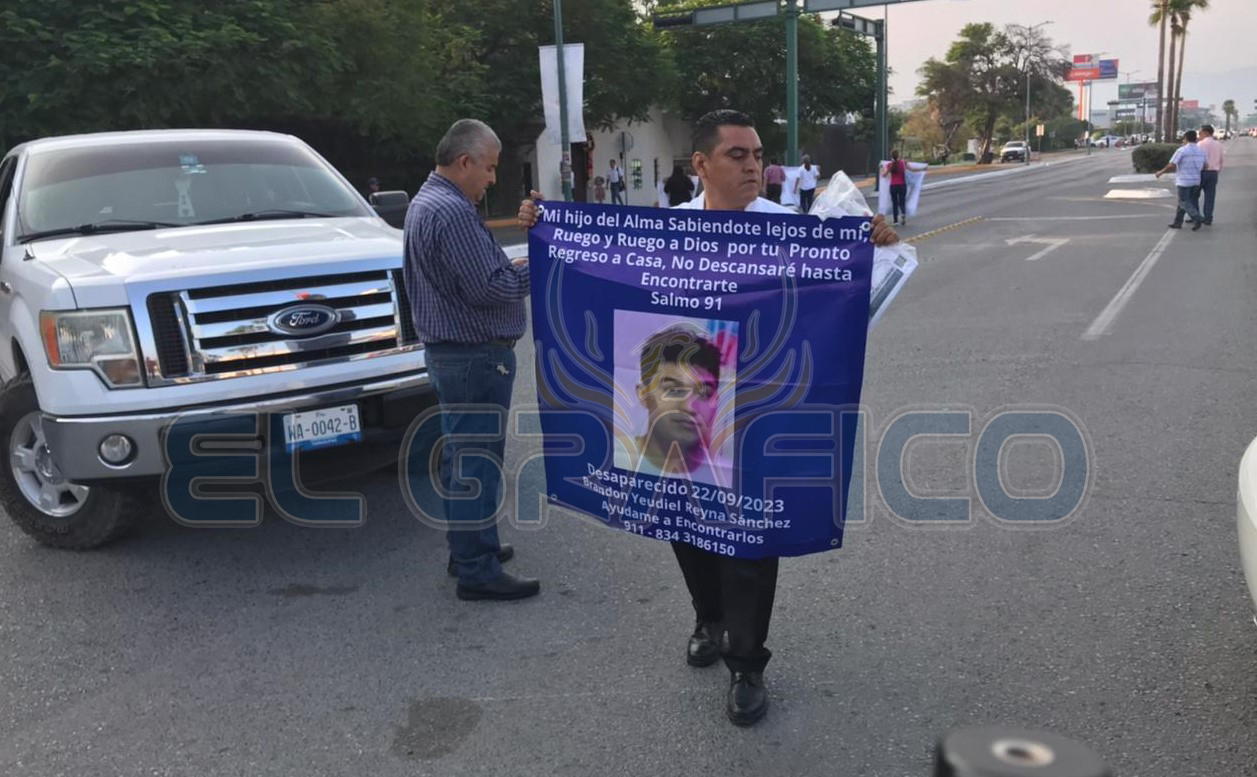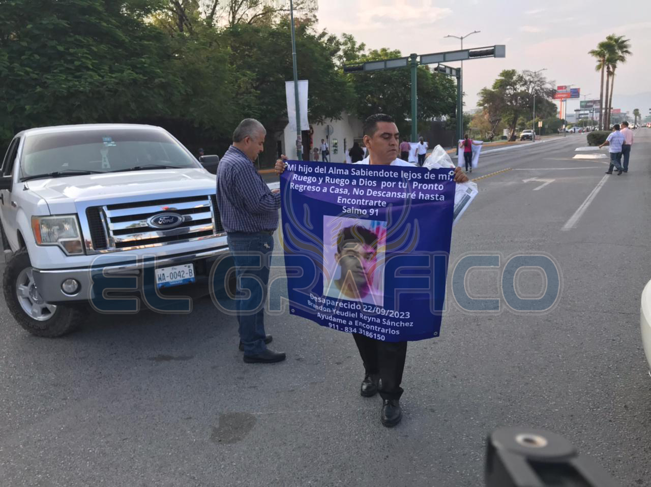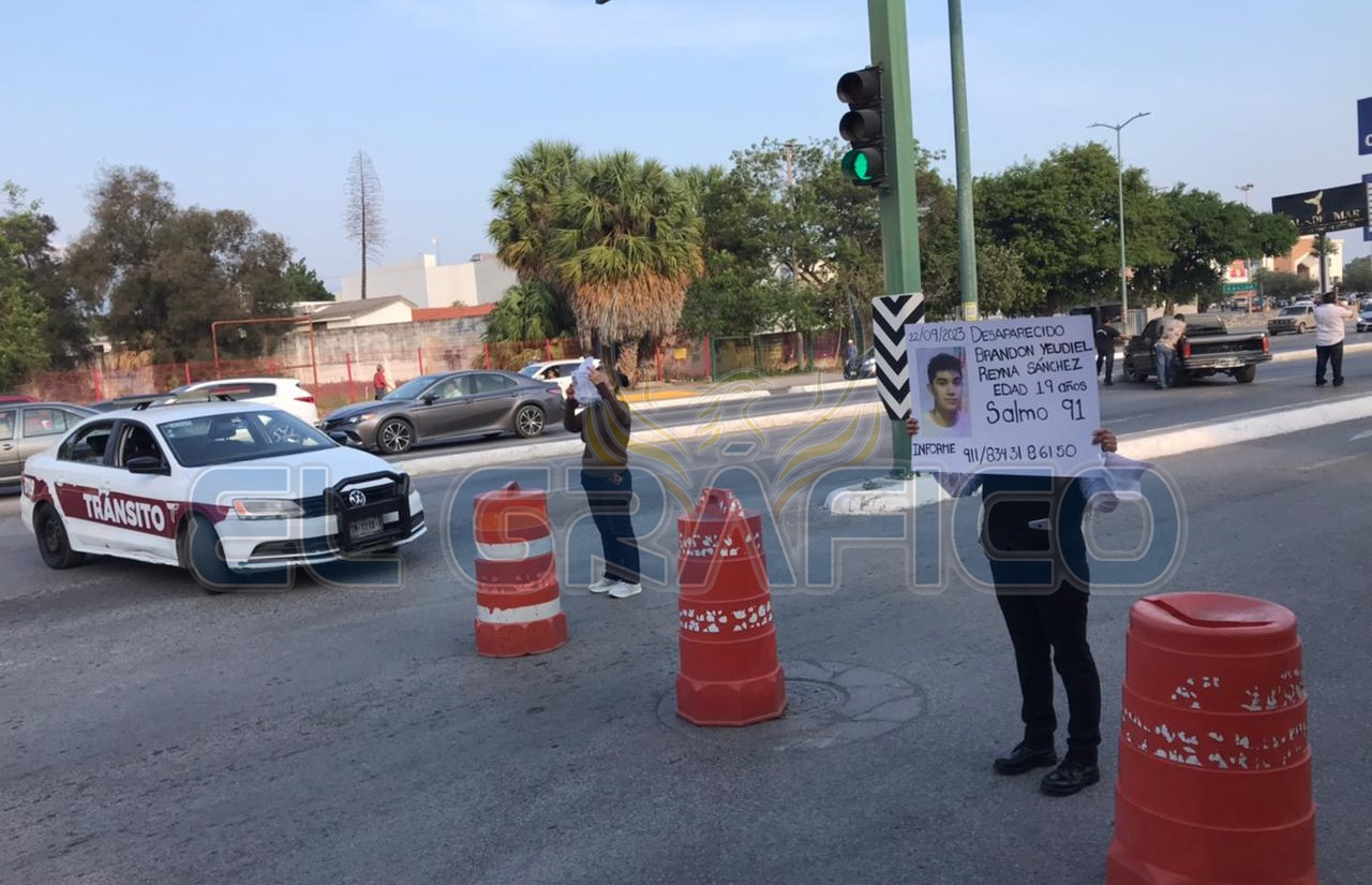Con vehículos particulares, y portando cartulinas y copias del Boletín de Búsqueda emitido por la Fiscalía General de Justicia del Estado, esta mañana familiares y amigos de un joven de 19 años de edad que fue reportado como desaparecido el mes de septiembre cerraron la vialidad del Bulevar Tamaulipas frente a Casa de Gobierno.