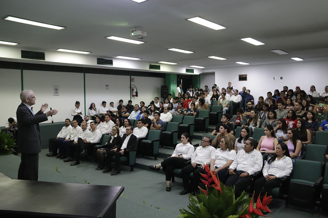 Con la asistencia de docentes, estudiantes, directivos, exdirectivos y exalumnos, el Dr. Jesús Gerardo Delgado Rivas, director de la FCAV, expresó el mensaje de aniversario y reconoció el respaldo que ha dado el rector de la UAT, C.P. Guillermo Mendoza Cavazos, para seguir siendo una institución a la vanguardia en la educación superior.