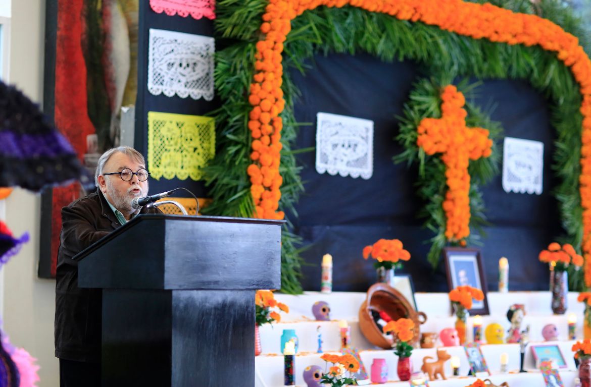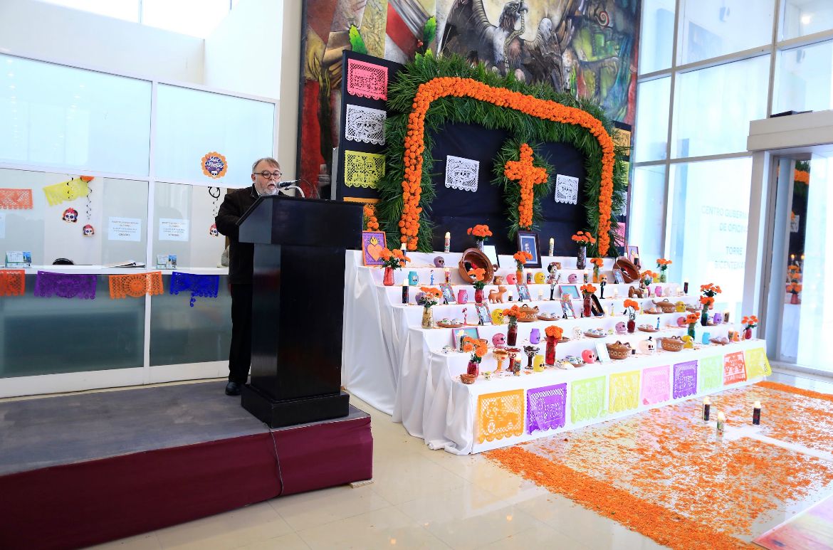 Ciudad Victoria, Tamaulipas.- “Los altares de muertos son un tributo a nuestra identidad, a nuestra historia, a nuestros seres queridos y a nuestra manera de entender la vida y la muerte”, expresó el secretario de Administración Jesús Lavín Verástegui al presentar el altar de muertos que se instaló en la Torre Bicentenario de Ciudad Victoria, el cual fue dedicado a los gobernadores de Tamaulipas, y muy especialmente al ingeniero Américo Villarreal Guerra, padre del gobernador Américo Villarreal Anaya.