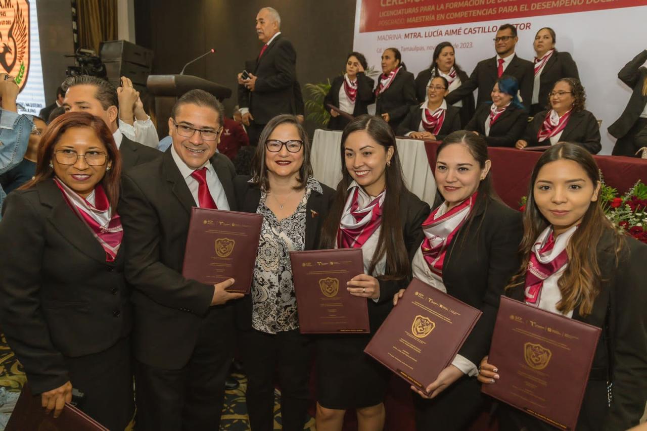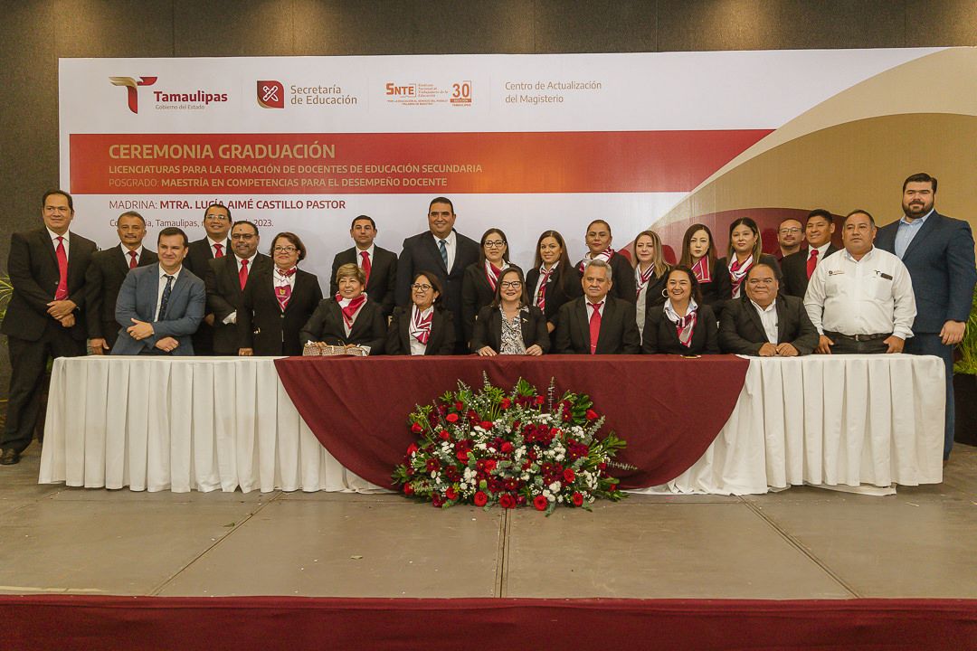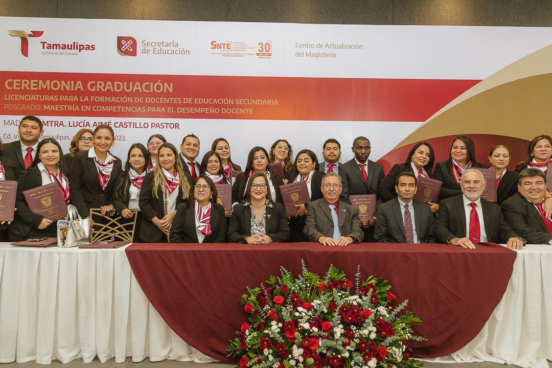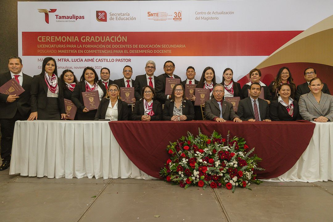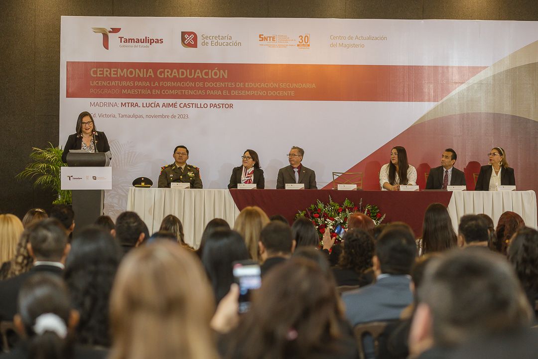 Ciudad Victoria, Tamaulipas.- Con la participación de 126 egresados originarios de los municipios de Nuevo Laredo, Reynosa, Matamoros, Victoria, Tampico y Madero, se llevó a cabo la ceremonia de graduación del Centro de Actualización del Magisterio de Tamaulipas (CAM), presidida por la secretaria de Educación en el estado, Lucía Aimé Castillo Pastor, quien acudió como representante personal del gobernador Américo Villarreal Anaya.