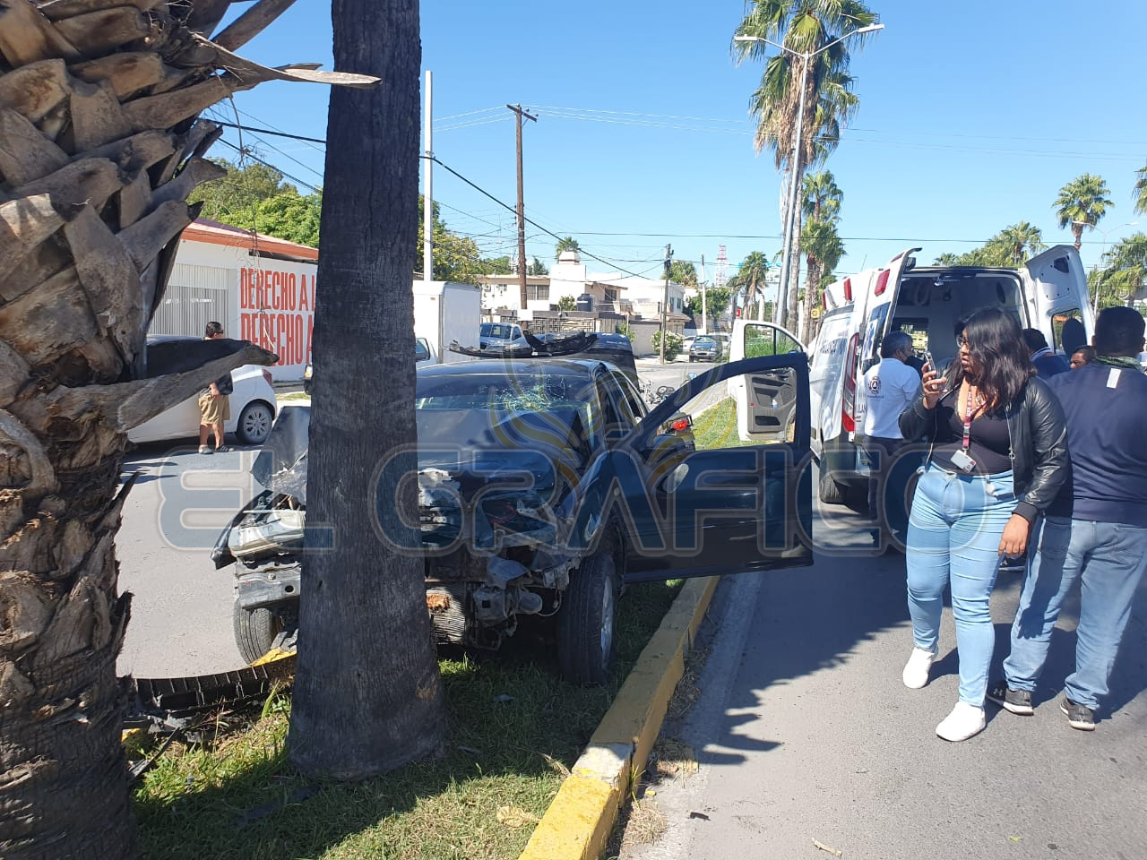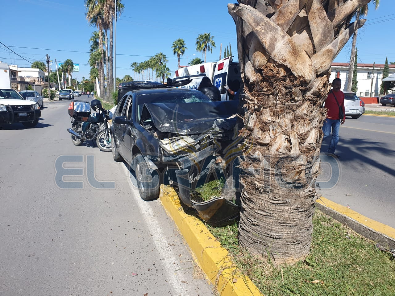 Finalmente el automóvil Jetta desvió su trayectoria hacia su lado derecho y a la altura de la calle Anaya se trepó al divisor de carriles para terminar su carrera sin control impactándose de manera frontal contra una palmera.