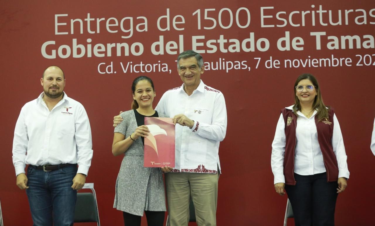 Ciudad Victoria, Tamaulipas.- El gobernador Américo Villarreal Anaya presidió la ceremonia de entrega de 1,500 escrituras que garantizan la certeza jurídica y la propiedad de familias que en algunos casos esperaron hasta 22 años para tener en sus manos este documento y aseguró que en Tamaulipas ya no debe de haber asentamientos irregulares, “eso se tiene que acabar”, afirmó.