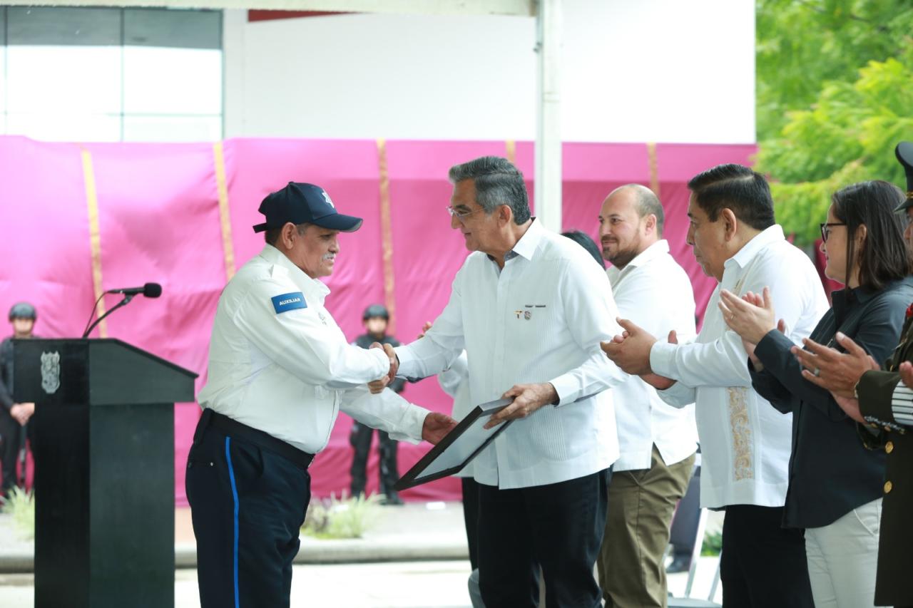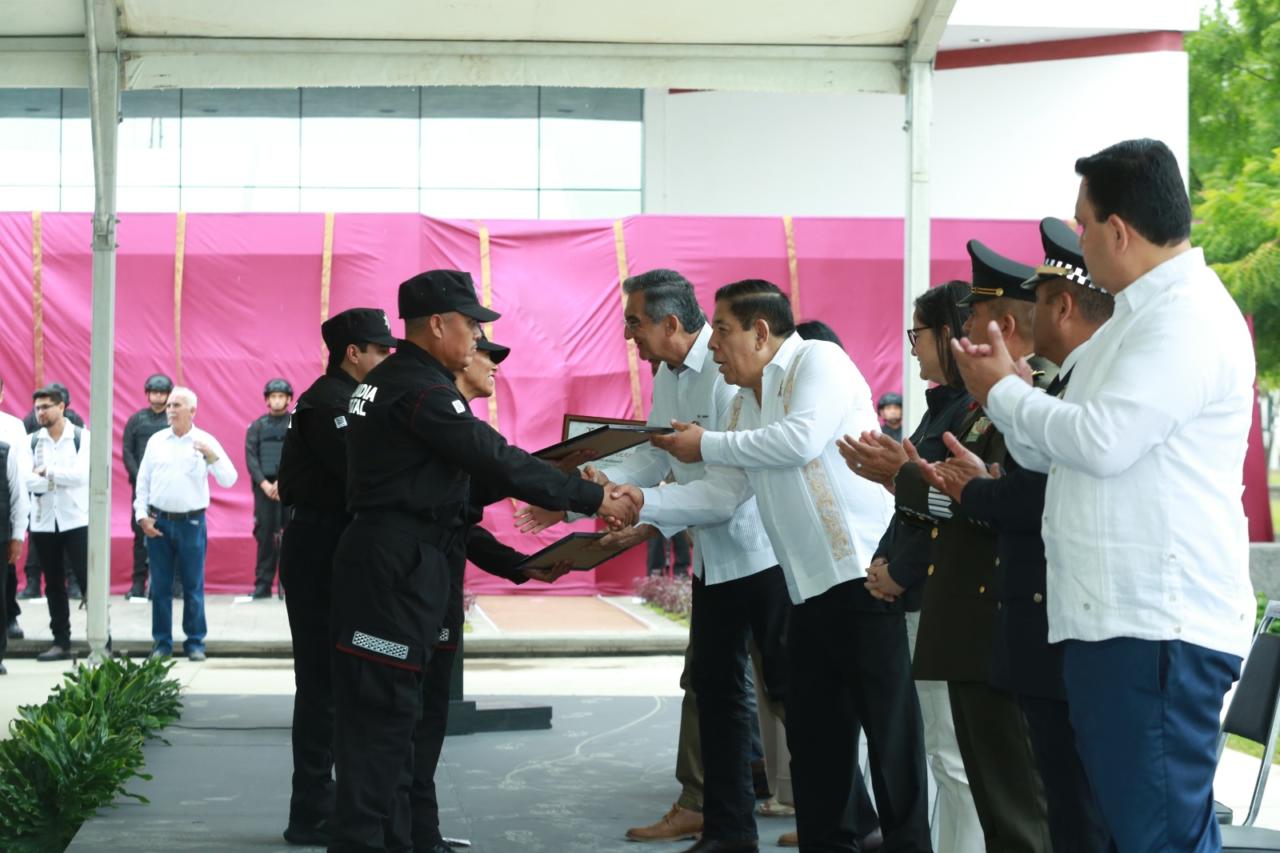 Asimismo entregó 192 constancias de ascenso de grados al personal de la corporación y la condecoración de perseverancia por servicios ininterrumpidos a un policía por 41 años de servicio y a una custodio por 32 años de trabajo, además de distinciones a un comandante por sus actos de heroísmo en el operativo de la frontera chica y a dos integrantes de la Guardia Estatal por destacar en el ámbito deportivo.