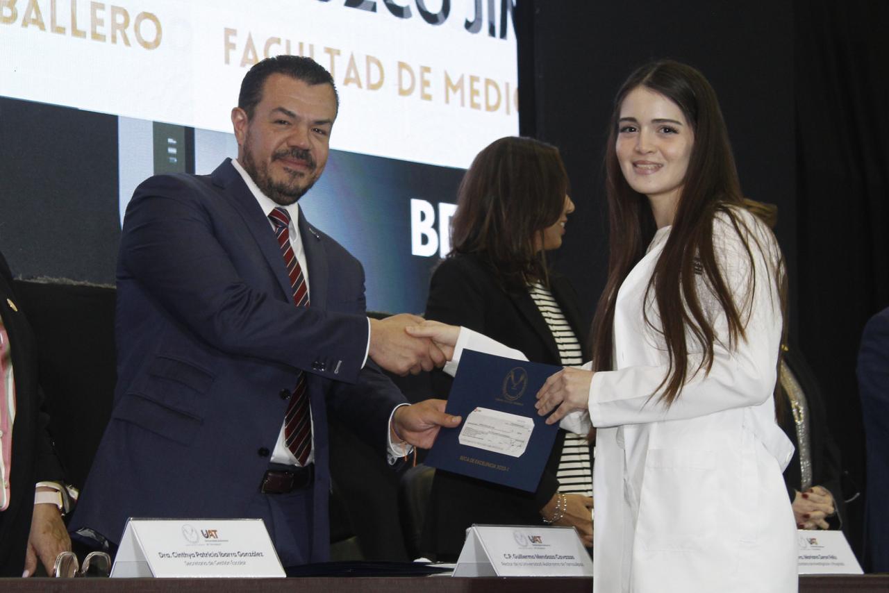 Acompañado por la Dra. Cinthya Patricia Ibarra González, secretaria de Gestión Escolar de la UAT, el C.P. Guillermo Mendoza felicitó al alumnado por el esfuerzo sobresaliente que les ha permitido recibir esta distinción.