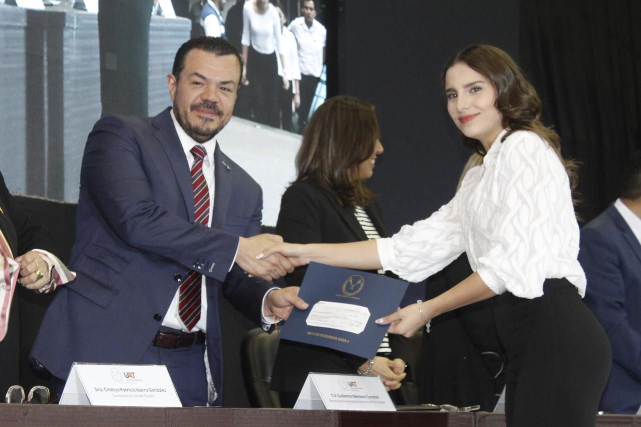 El rector de la Universidad Autónoma de Tamaulipas (UAT), C.P. Guillermo Mendoza Cavazos, presidió en el Centro Universitario Sur (Campus Tampico) la ceremonia de entrega de becas de excelencia a estudiantes que se destacaron por obtener el más alto promedio académico de su generación durante el período escolar 2023-1.