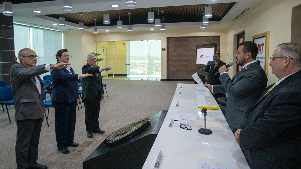 En ceremonia efectuada en la sala ejecutiva del Centro de Gestión del Conocimiento del Campus Victoria, rindieron protesta como integrantes de ese órgano colegiado: el Ing. Pedro Mier Llaguno, presidente; la Mtra. Blanca Saldívar Ruedas, secretaria; y el Lic. Rodolfo Higuera Terán, como vocal.