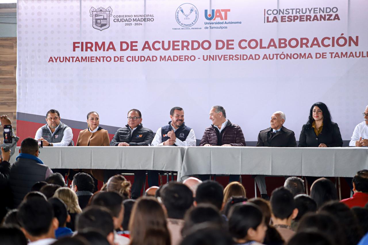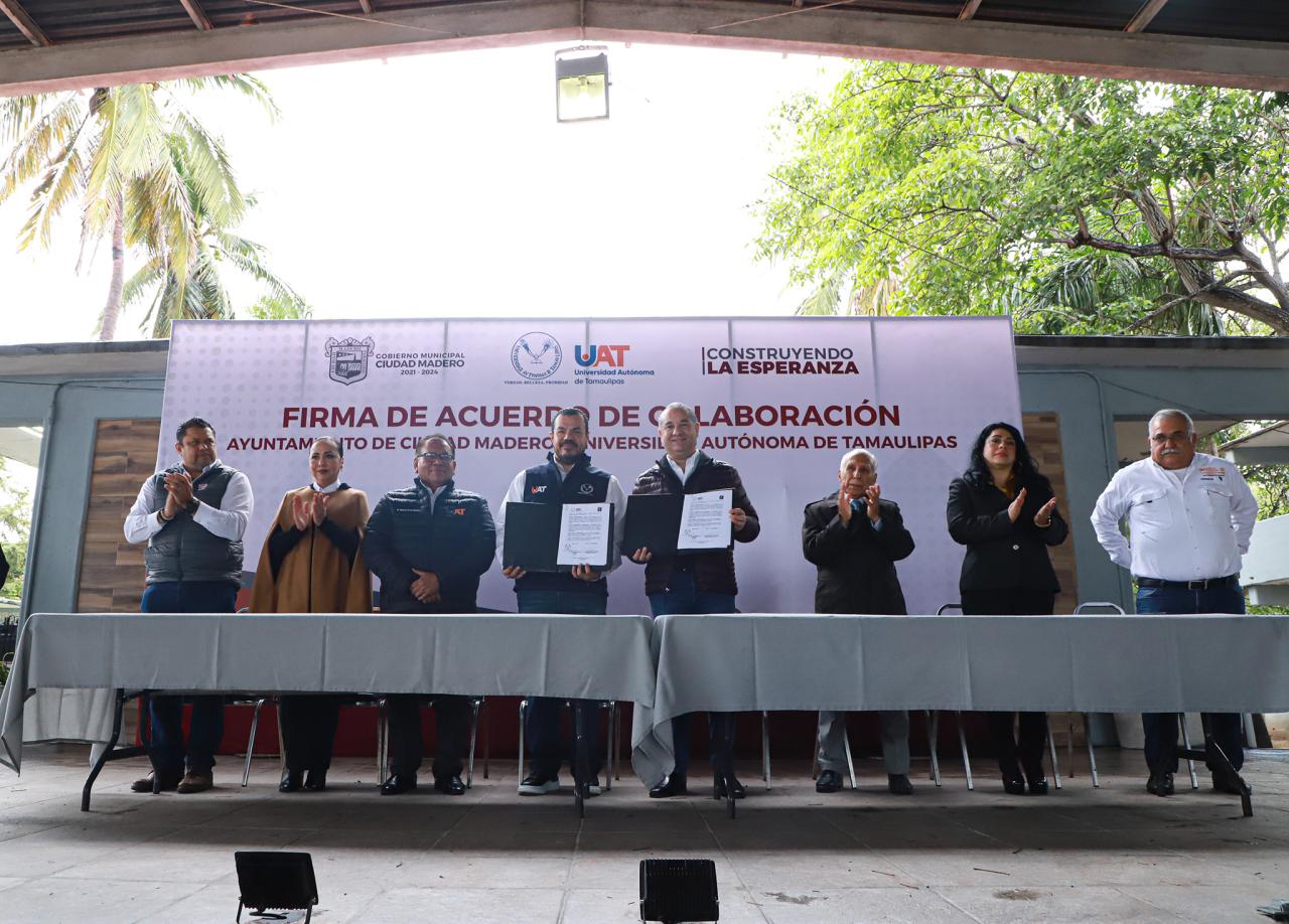 La Universidad Autónoma de Tamaulipas (UAT) y el Ayuntamiento de Ciudad Madero, llevaron a cabo la firma de un convenio de colaboración que permitirá unir esfuerzos en programas de beneficio a la comunidad con la participación de especialistas, académicos y estudiantes de la Facultad de Arquitectura, Diseño y Urbanismo (FADU) de la máxima casa de estudios de la entidad.