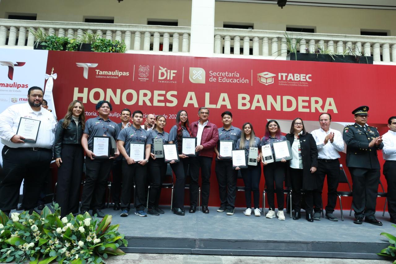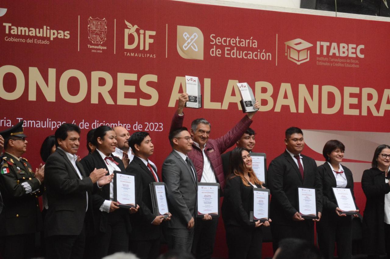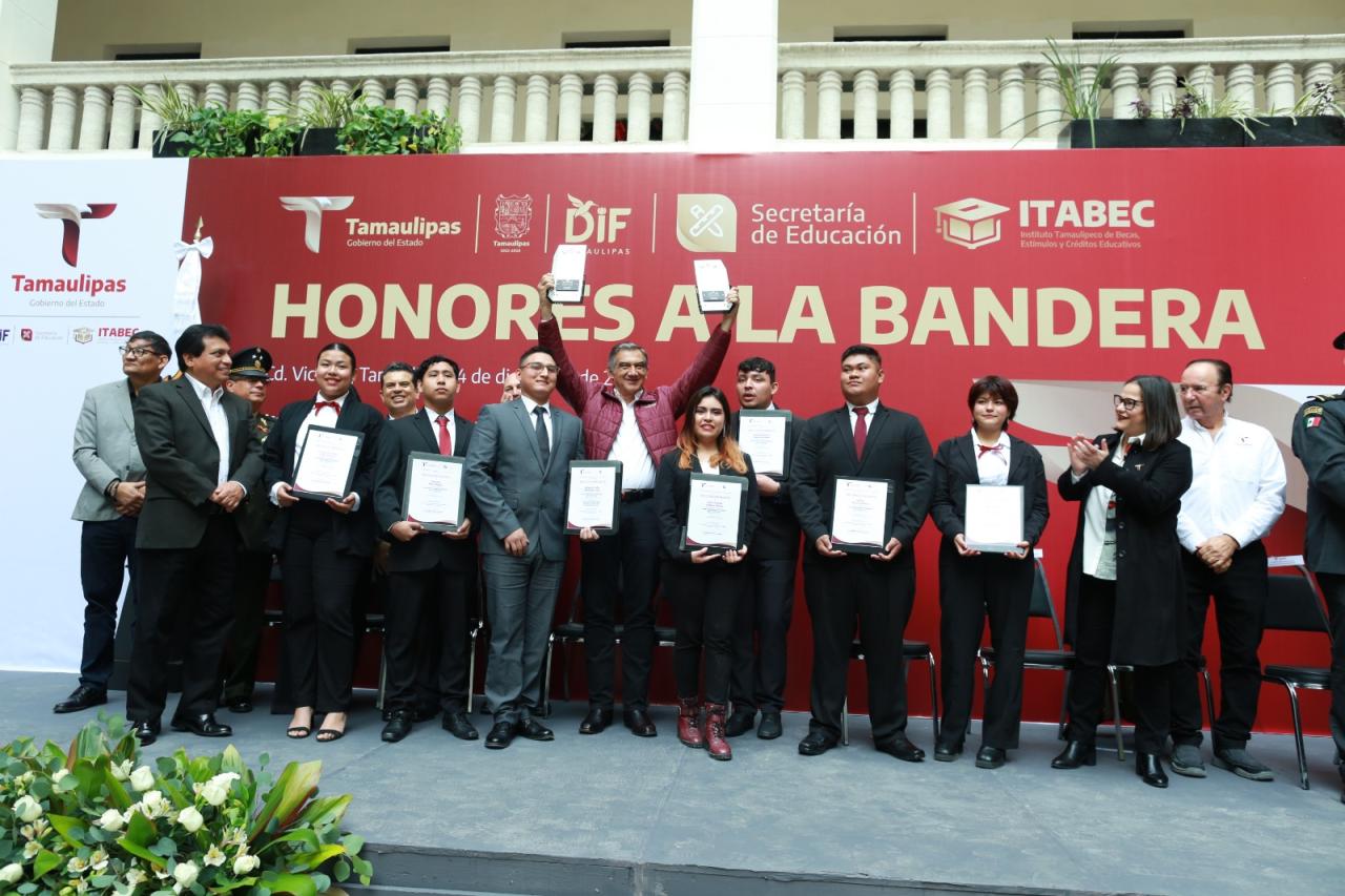 Durante la ceremonia cívica de honores, celebrada este lunes en el patio central de Palacio de Gobierno, el mandatario tamaulipeco otorgó becas y reconoció a los alumnos de diferentes planteles que a lo largo del presente ciclo escolar destacaron en eventos nacionales e internacionales, además de reiterar todo su compromiso y apoyo para lograr una educación de excelencia en Tamaulipas.