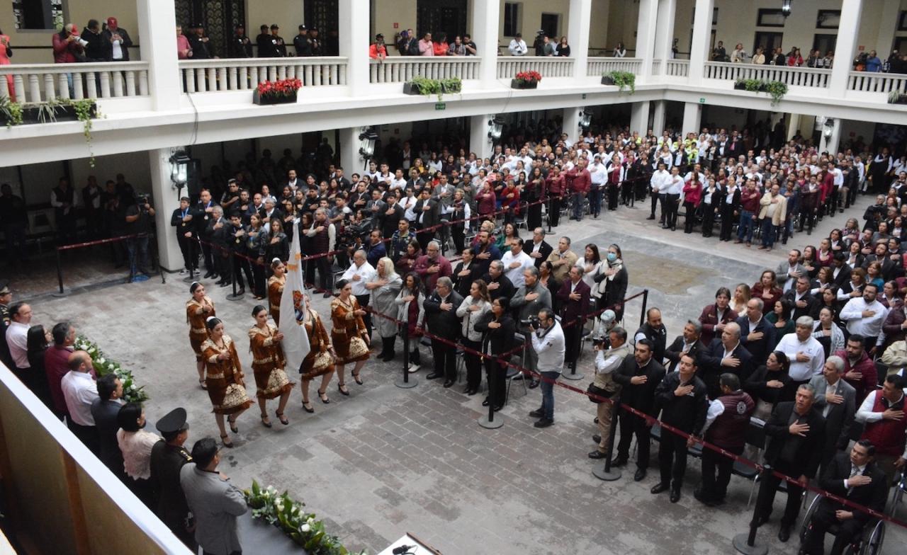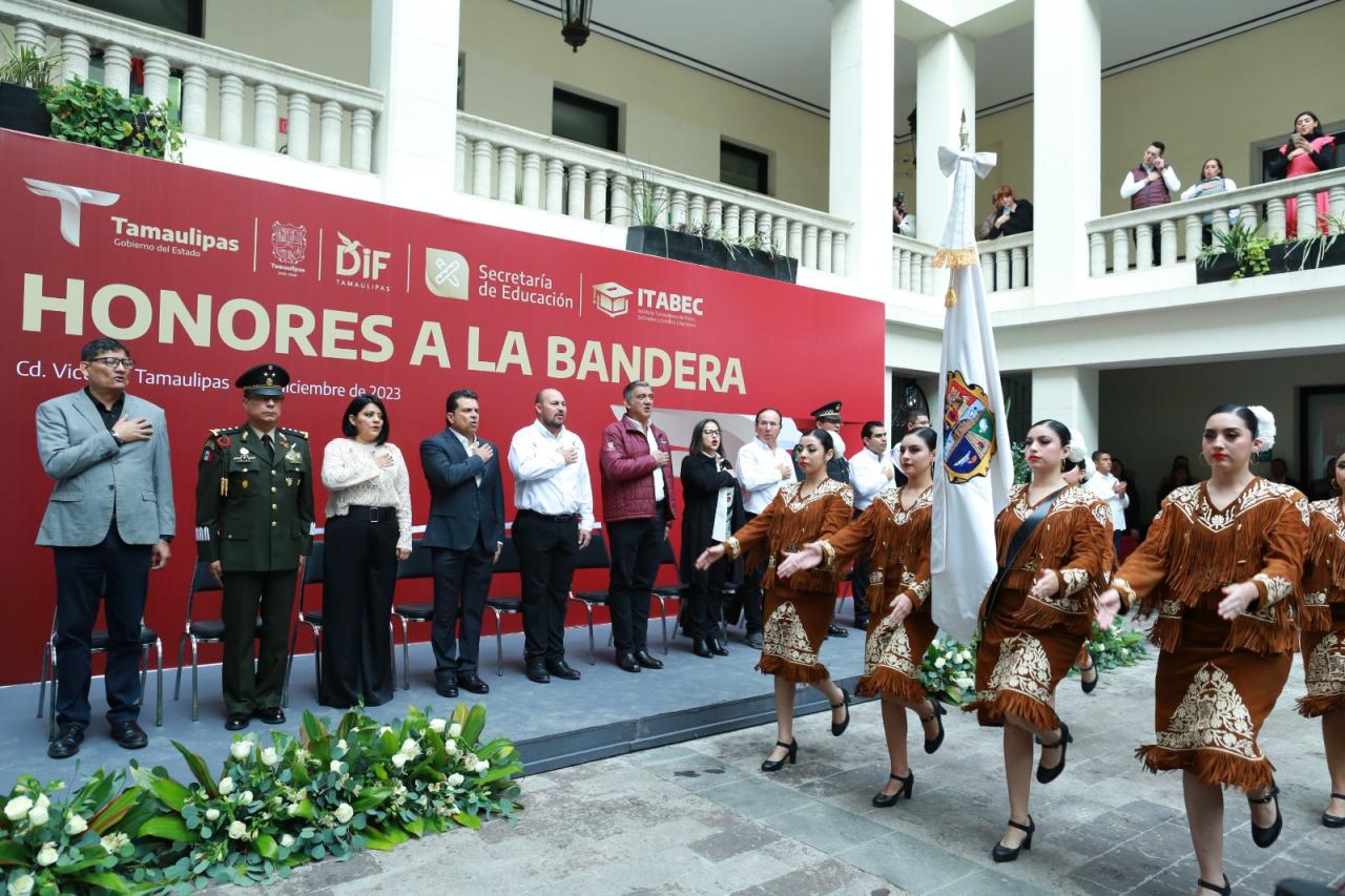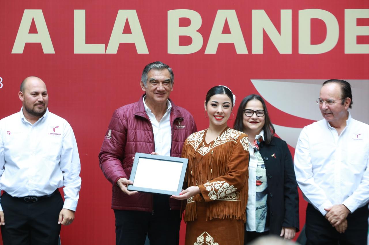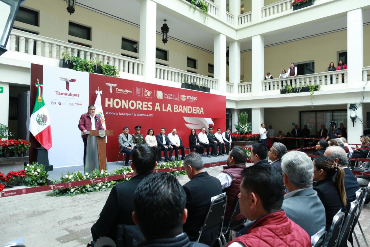 Durante la ceremonia cívica de honores, celebrada este lunes en el patio central de Palacio de Gobierno, el mandatario tamaulipeco otorgó becas y reconoció a los alumnos de diferentes planteles que a lo largo del presente ciclo escolar destacaron en eventos nacionales e internacionales, además de reiterar todo su compromiso y apoyo para lograr una educación de excelencia en Tamaulipas.
