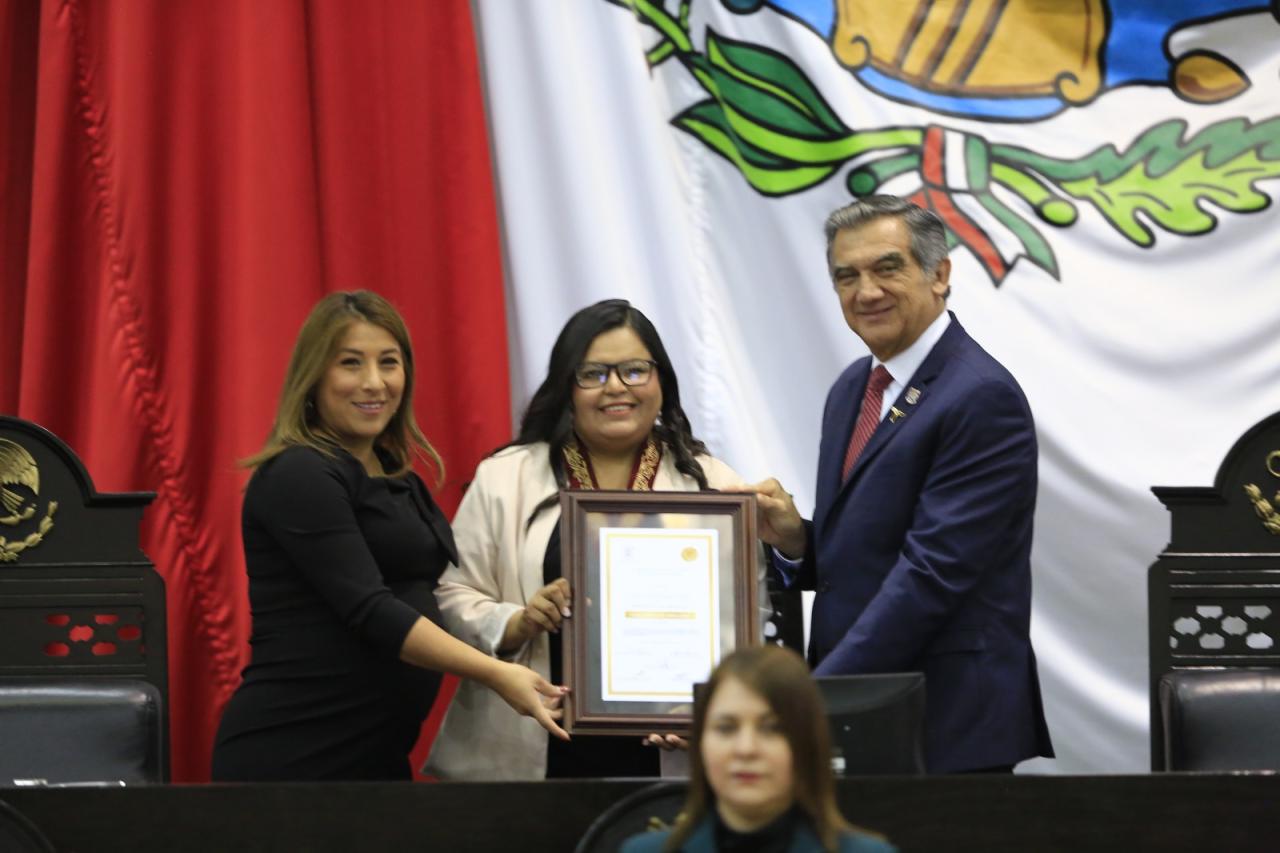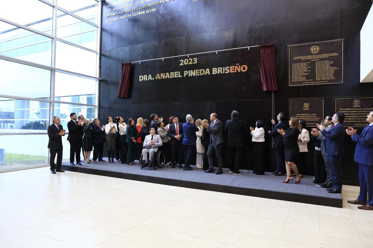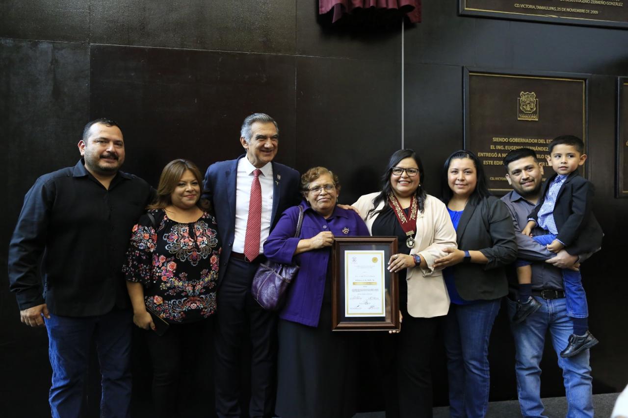 Acompañado por la presidenta de la Mesa Directiva del Congreso del Estado, diputada Linda Mireya González Zúñiga y por el presidente del Supremo Tribunal de Justicia, magistrado David Cerda Zúñiga, el gobernador de Tamaulipas entregó el reconocimiento a la doctora matamorense y también develó el nombre de la galardonada inscrito con letras de oro en el Muro de Honor del Palacio Legislativo.