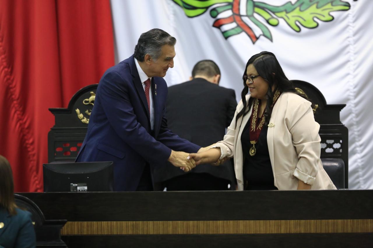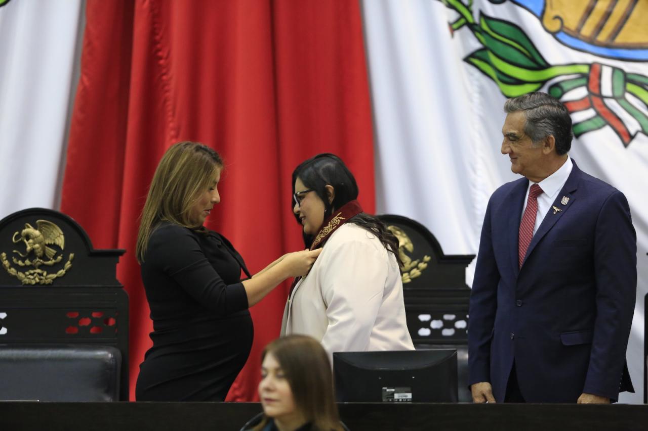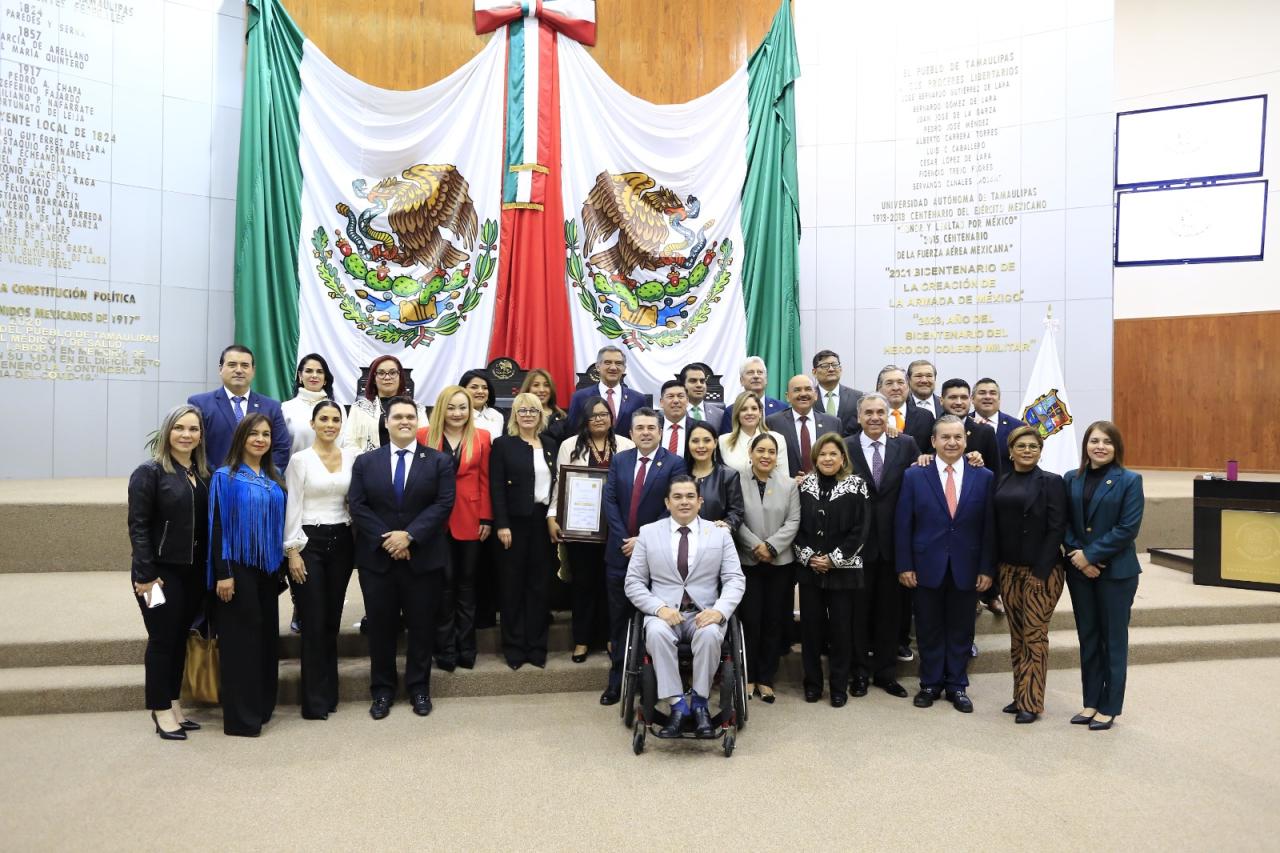 Acompañado por la presidenta de la Mesa Directiva del Congreso del Estado, diputada Linda Mireya González Zúñiga y por el presidente del Supremo Tribunal de Justicia, magistrado David Cerda Zúñiga, el gobernador de Tamaulipas entregó el reconocimiento a la doctora matamorense y también develó el nombre de la galardonada inscrito con letras de oro en el Muro de Honor del Palacio Legislativo.