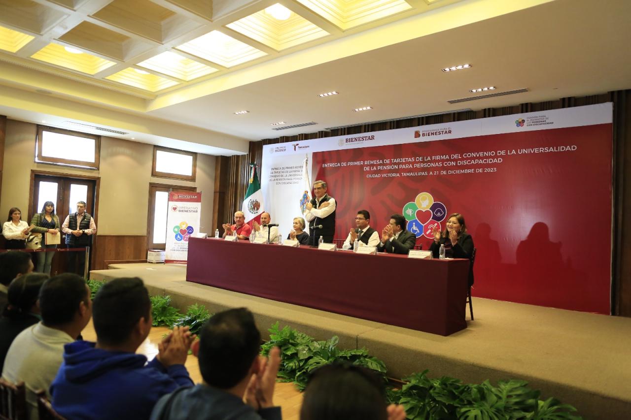 Ciudad Victoria, Tamaulipas.- El gobernador Américo Villarreal Anaya y la presidenta del DIF Tamaulipas, María Santiago de Villarreal, iniciaron la entrega de la primera remesa de 2 mil 400 tarjetas de la firma del convenio de la universalidad de la pensión para personas con discapacidad, en un evento que refleja el sentido humanista del Gobierno del Estado en la búsqueda de una mejor sociedad, mejor desarrollo y bienestar social.