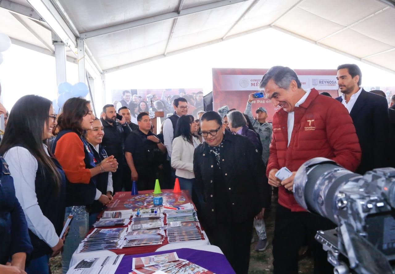 Reynosa, Tamaulipas. - En Tamaulipas las condiciones de seguridad mejoran y van a la baja los índices delictivos en la mayoría de los delitos, reconoció la secretaria de Seguridad y Protección Ciudadana, Rosa Icela Rodríguez Velázquez al encabezar la Feria de Paz junto con el gobernador Américo Villarreal Anaya, en este municipio fronterizo.