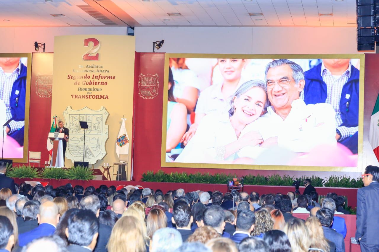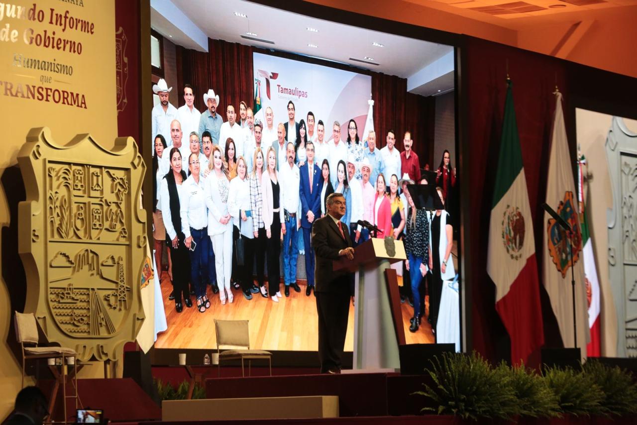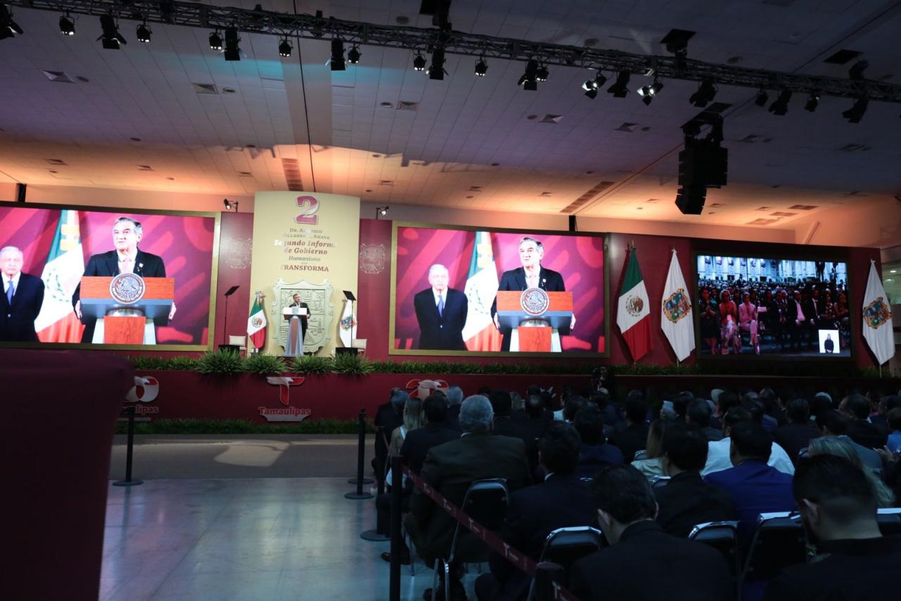 Ante la presencia de la presidenta del DIF, Tamaulipas, María de Villarreal y titulares de los Poderes Legislativo y Judicial, integrantes del gabinete federal, legisladores, mandos militares y de las fuerzas armadas, dirigentes de organismos industriales, cámaras empresariales y representantes de todos los sectores productivos, el mandatario tamaulipeco señaló que el segundo informe entregado este día al Honorable Congreso de Tamaulipas sobre el estado que guarda la administración pública, describe de manera detallada las 857 acciones realizadas, atendiendo a los marcos estratégicos de la planeación democrática y aterrizan en los objetivos de los tres grandes ejes del Plan Estatal de Desarrollo: Gobierno al Servicio del Pueblo, Desarrollo Inclusivo y Sostenible y Política Social para el Bienestar.