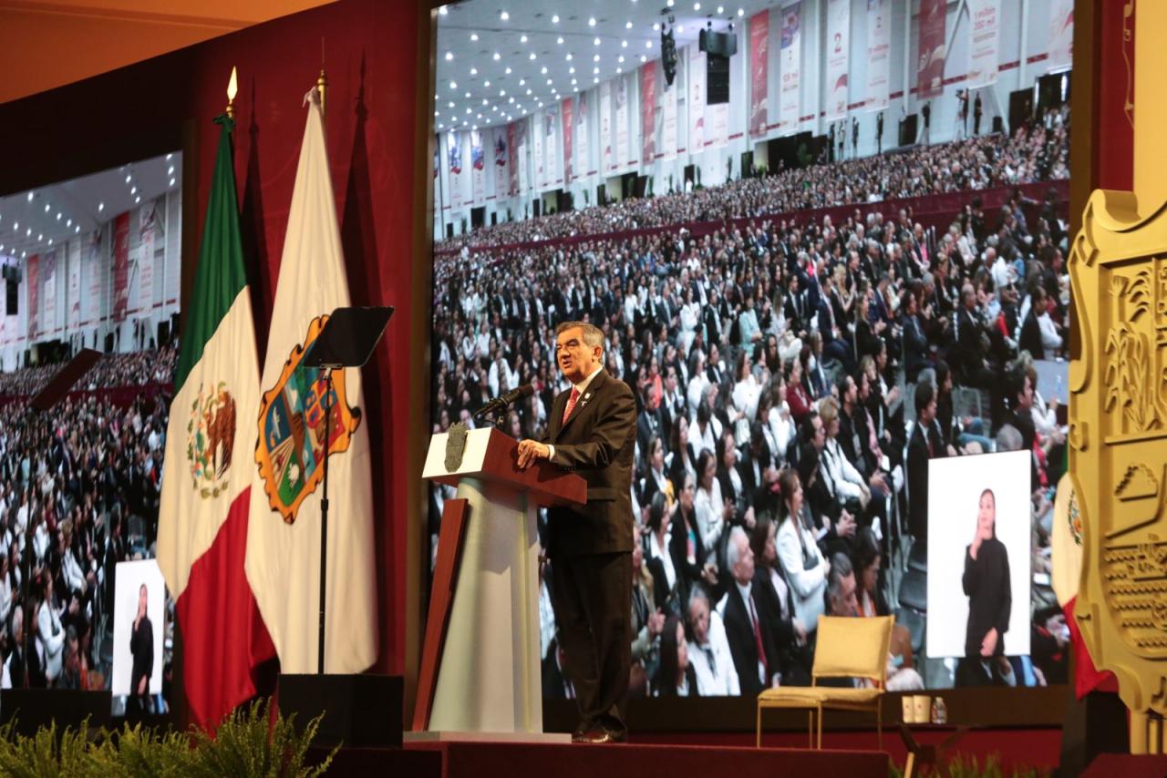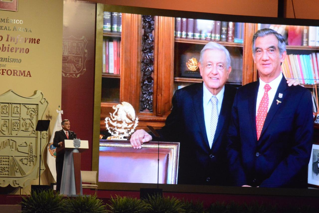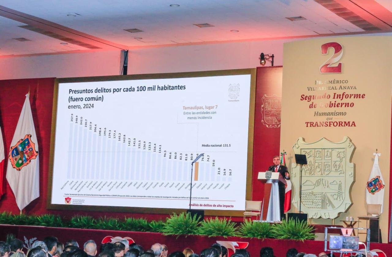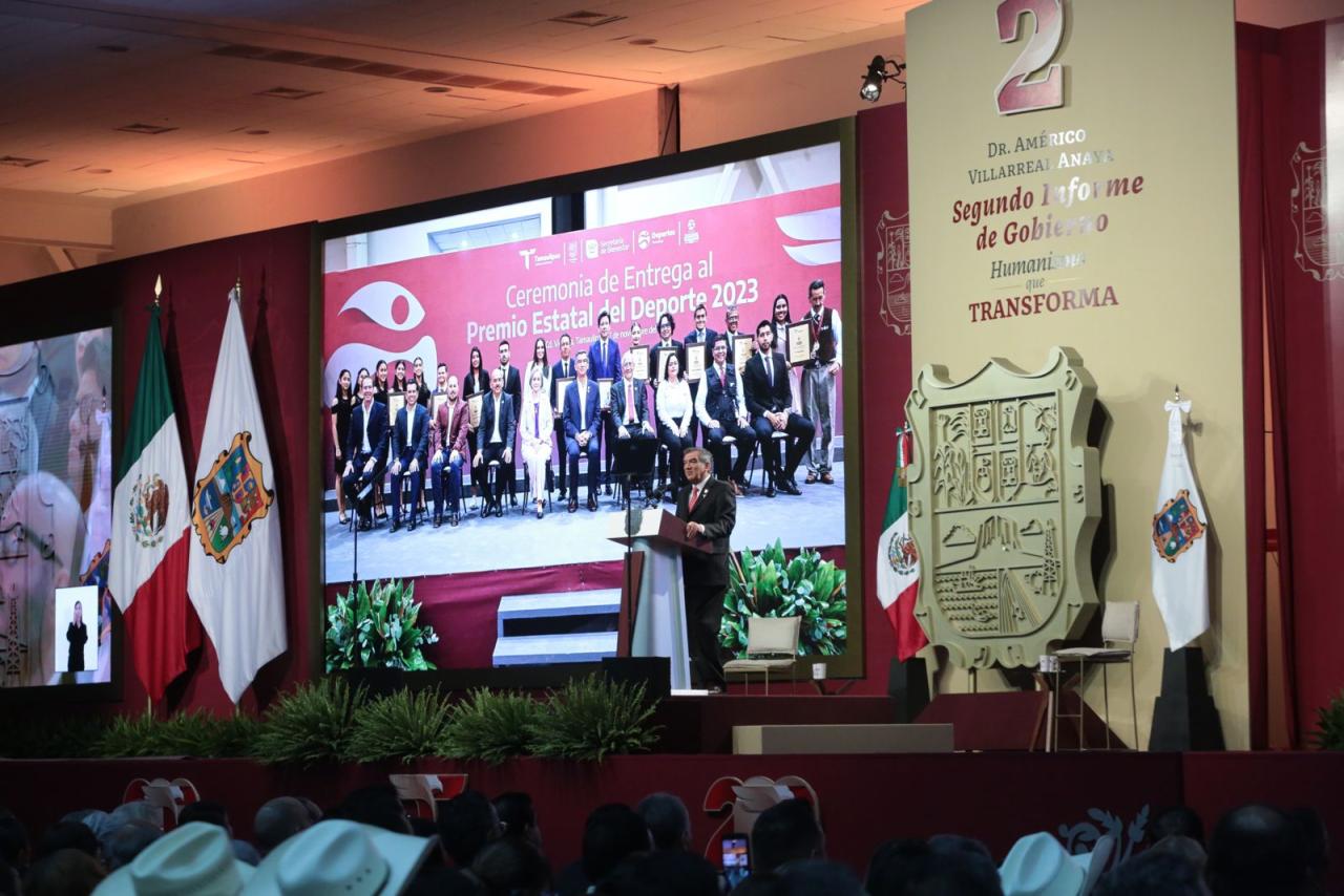 Ante la presencia de la presidenta del DIF, Tamaulipas, María de Villarreal y titulares de los Poderes Legislativo y Judicial, integrantes del gabinete federal, legisladores, mandos militares y de las fuerzas armadas, dirigentes de organismos industriales, cámaras empresariales y representantes de todos los sectores productivos, el mandatario tamaulipeco señaló que el segundo informe entregado este día al Honorable Congreso de Tamaulipas sobre el estado que guarda la administración pública, describe de manera detallada las 857 acciones realizadas, atendiendo a los marcos estratégicos de la planeación democrática y aterrizan en los objetivos de los tres grandes ejes del Plan Estatal de Desarrollo: Gobierno al Servicio del Pueblo, Desarrollo Inclusivo y Sostenible y Política Social para el Bienestar.