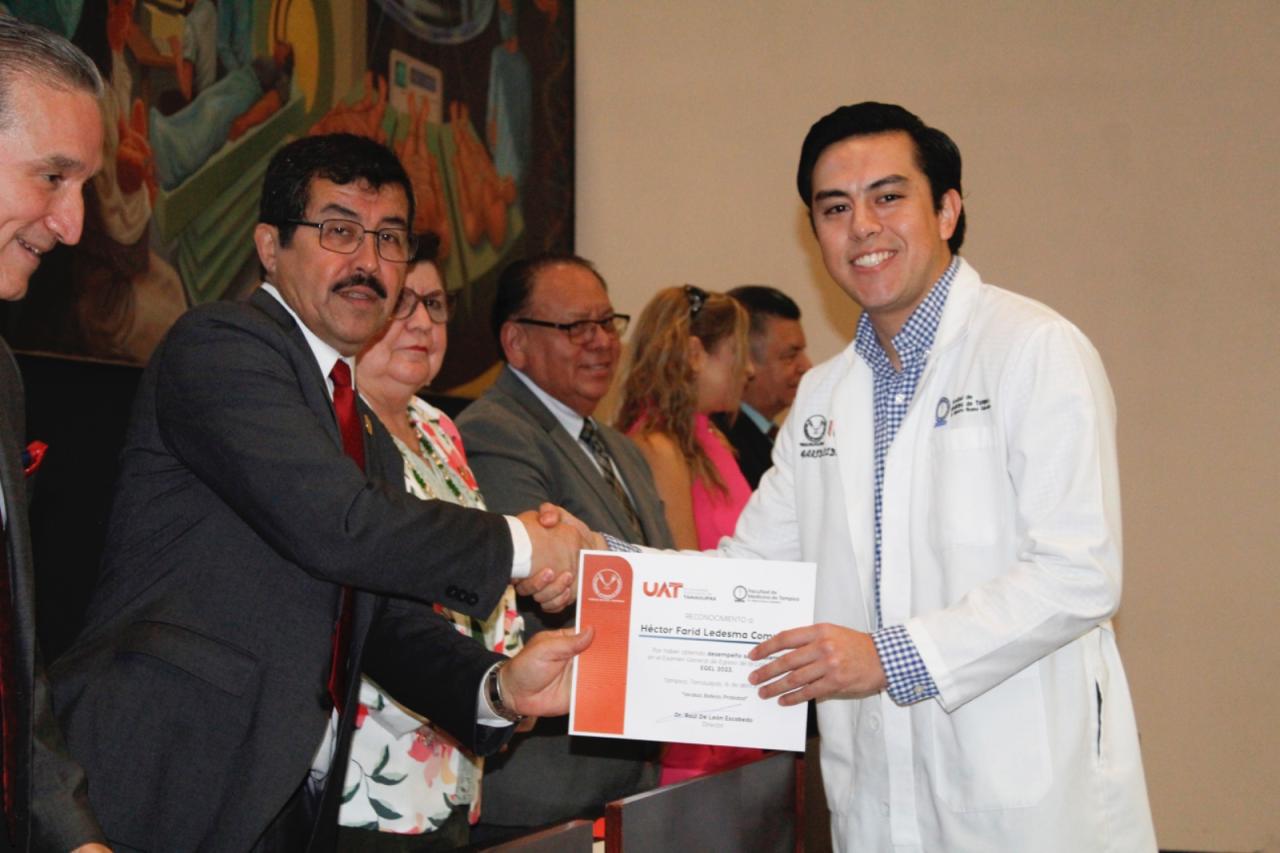 El MVZ Dámaso Leonardo Anaya Alvarado, rector de la Universidad Autónoma de Tamaulipas (UAT), entregó reconocimientos a treinta y siete profesionales de la medicina que concluyeron su formación con la más alta calificación del Examen General de Egreso (EGEL) del Centro Nacional de Evaluación para la Educación Superior (CENEVAL).