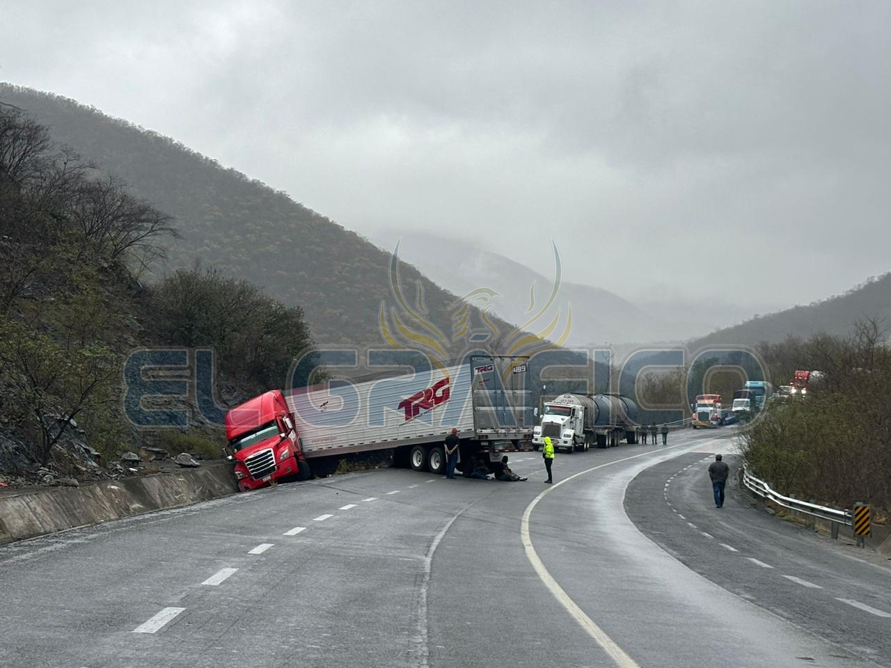 Personal de Apoyo Carretero de la Estación Segura Aeropuerto atendió el reporte de C4 que refería un accidente múltiple entre cuatro pesadas unidades que se impactaron y propiciaron el bloqueo de la vía de comunicación, presuntamente derivado a las condiciones climatológicas.