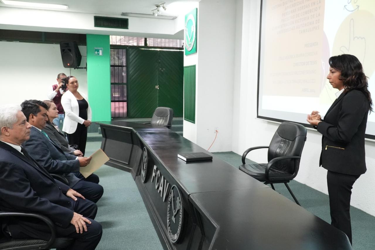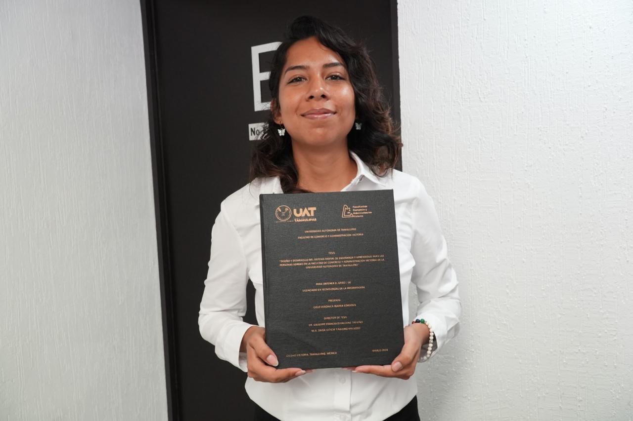 La Universidad Autónoma de Tamaulipas (UAT) reafirma su compromiso con la inclusión educativa al celebrar el éxito de Cielo Verónica Ibarra Córdova, estudiante de la Licenciatura en Tecnologías de la Información de la Facultad de Comercio y Administración Victoria (FCAV), quien presentó y acreditó su examen profesional de egreso, destacándose como miembro de la comunidad sorda y beneficiaria del Programa de Atención de Personas con Discapacidad CODIS UAT.