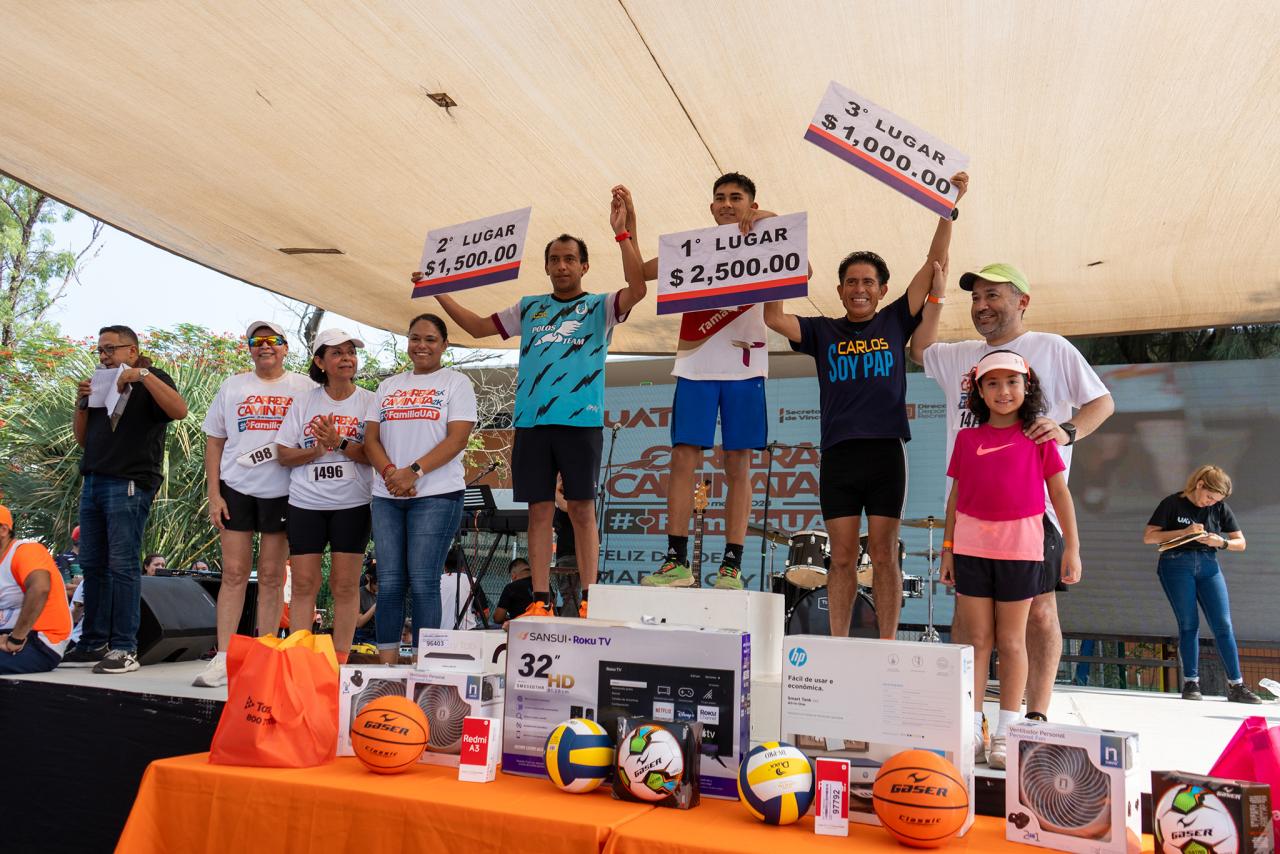 La salida fue frente al Estadio Universitario Prof. Eugenio Alvizo Porras y la premiación y rifa de regalos en el estacionamiento de la Facultad de Derecho y Ciencias Sociales Victoria.