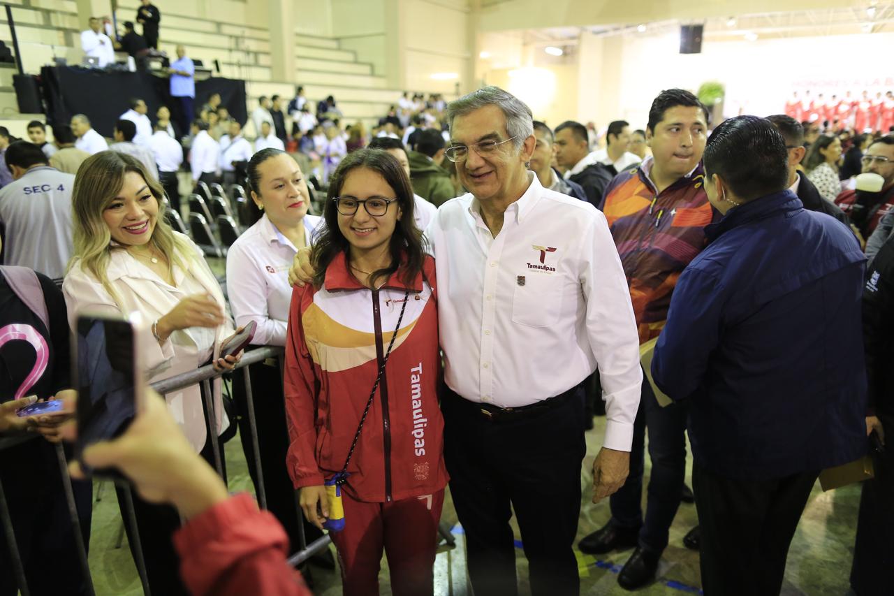 Ante el personal docente, padres de familia y la estructura del sector educativo del estado, y luego de la bienvenida a cargo de Esteban Carrizales Martínez, director de la Secundaria General No. 4, el mandatario hizo un reconocimiento a la delegación de 20 estudiantes, desde 1º de primaria hasta media superior, que representó a Tamaulipas en la Olimpiada Nacional de Matemáticas, en la que ocho alumnos lograron medallas de oro, plata y bronce.