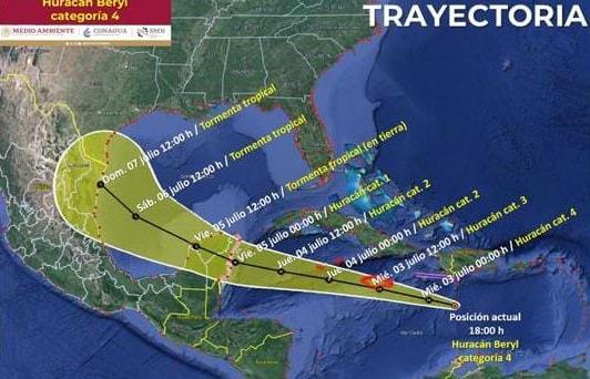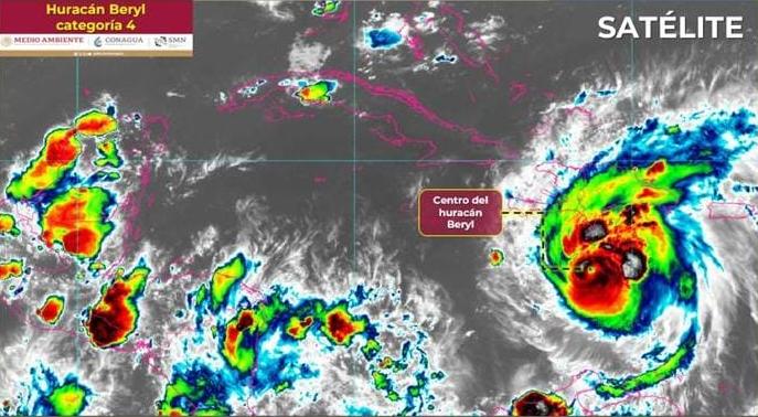 El centro del huracán Beryl de categoría 4 en la escala Saffir-Simpson, se localiza en el Mar Caribe, informó esta tarde el Servicio Meteorológico Nacional.