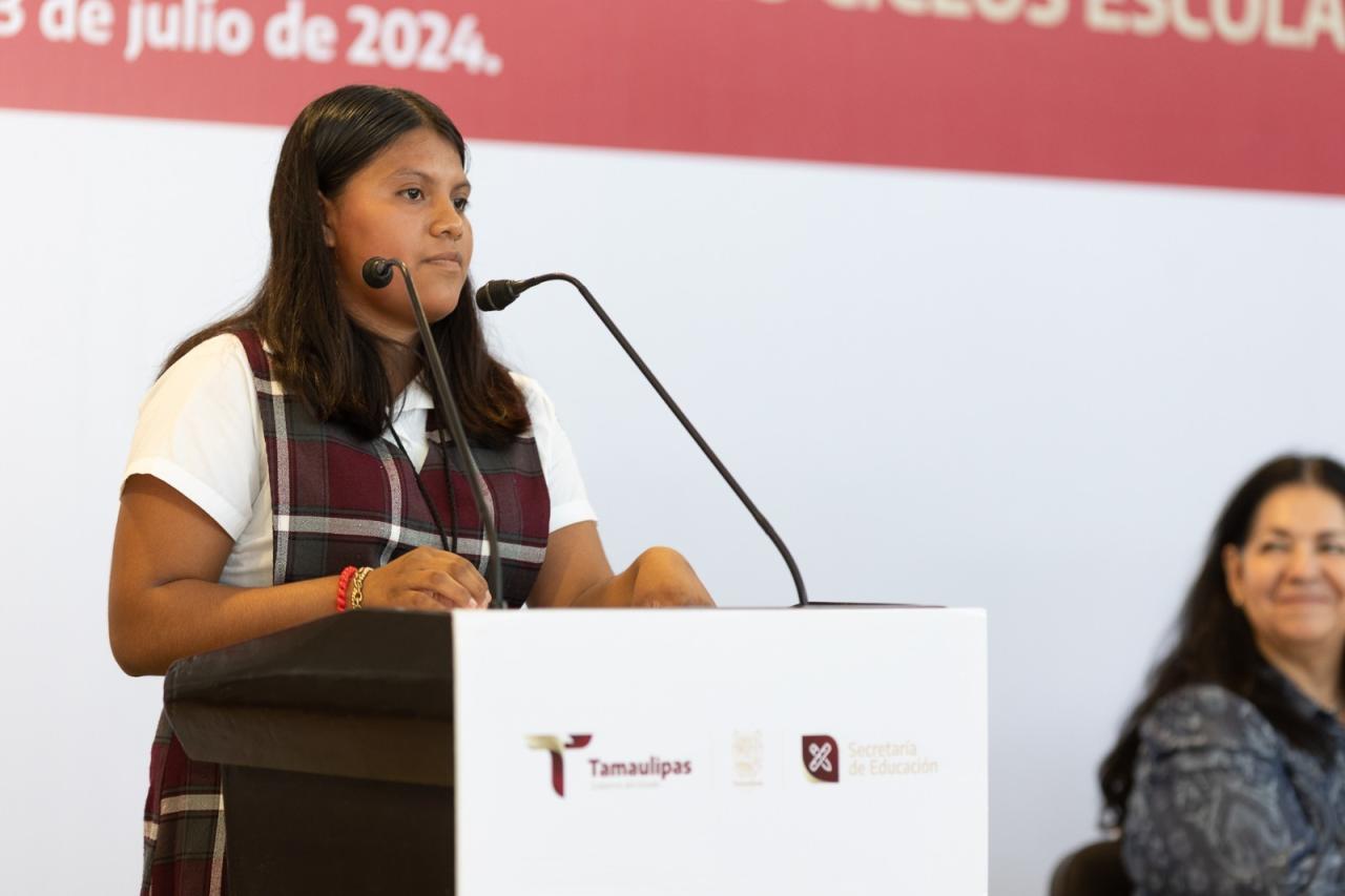 Durante la ceremonia se contó con la participación de la alumna Lizbeth Hernández del Ángel, quien cursó el sexto grado en la Escuela Primaria “Josefa Ortiz de Domínguez” de Reynosa, y de Brandon Damián Morín García, de sexto grado, de la Escuela Primaria “Emilio Carranza”, de El Mante, en representación de los estudiantes de los ciclos escolares 2022-2023 y 2023-2024, respectivamente.