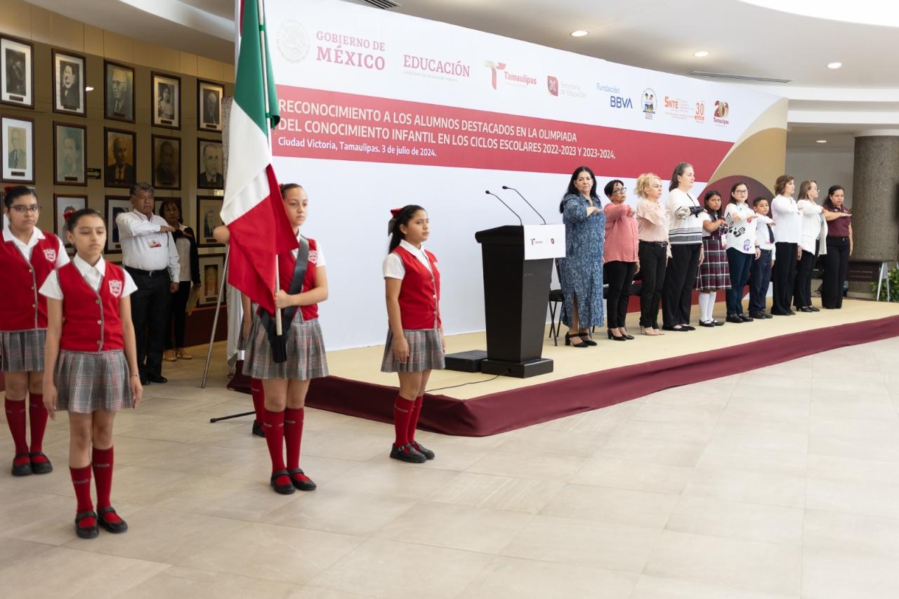 Ciudad Victoria, Tamaulipas. – Las y los estudiantes tamaulipecos de sexto grado más destacados, así como sus maestras y maestros, fueron reconocidos por obtener los mejores resultados en la Evaluación Estatal ‘Tamaulipas Aprende’ durante los ciclos escolares 2022-2023 y 2023-2024, esto dentro del marco de la Olimpiada del Conocimiento Infantil.