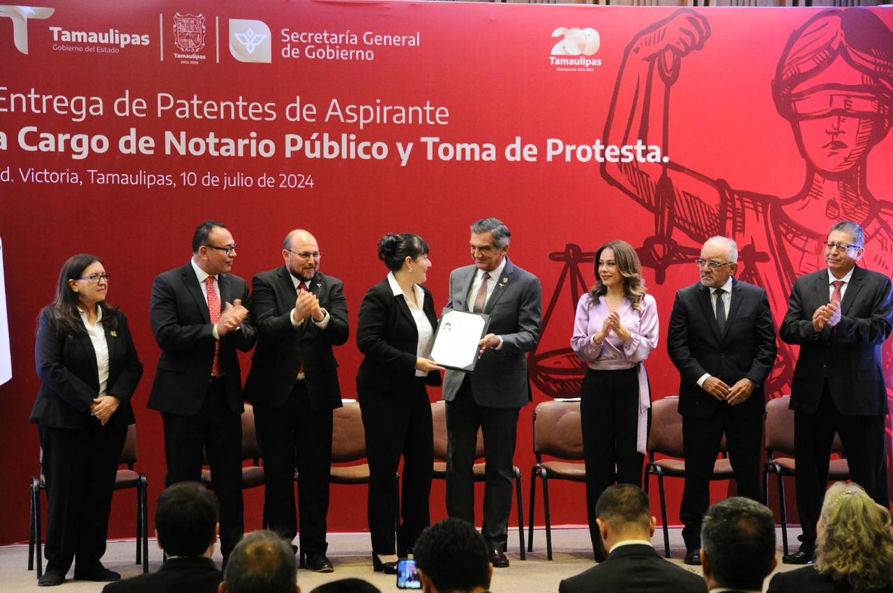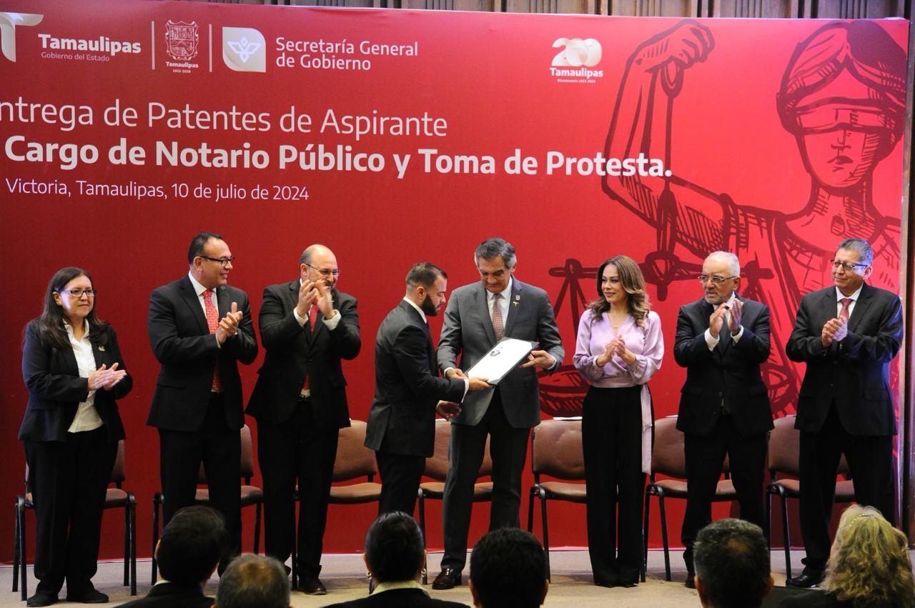 Ciudad Victoria, Tamaulipas.- El gobernador Américo Villarreal Anaya presidió la ceremonia de entrega de patentes de aspirante a notario público y tomó la protesta a cinco abogados y abogadas que acreditaron los requisitos de la Ley del Notariado del Estado de Tamaulipas y aprobaron el examen correspondiente y anunció que está por abrirse la convocatoria para los nuevos fiats.