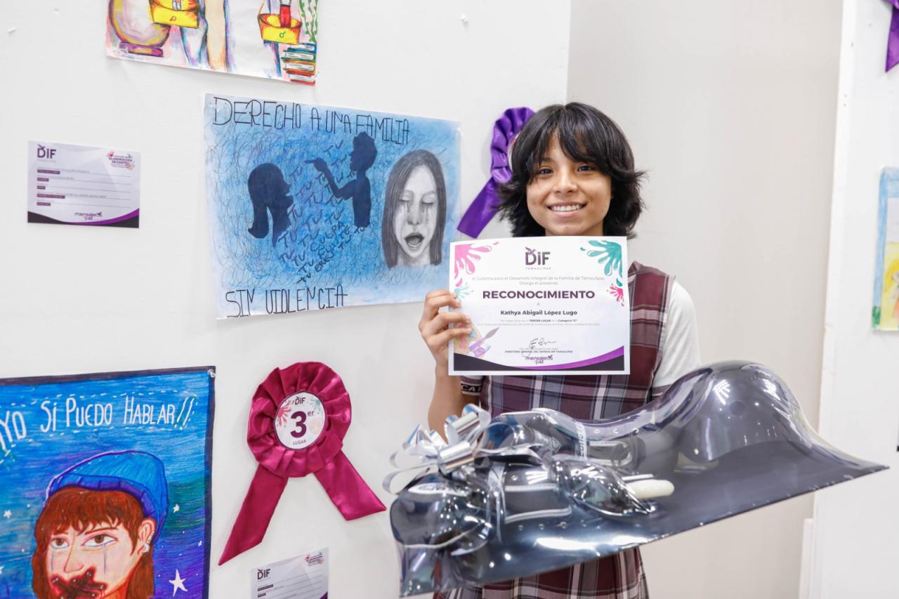 Ciudad Victoria, Tamaulipas. En reconocimiento al esfuerzo y la creatividad de niñas, niños y adolescentes que participaron en el concurso de elaboración de carteles sobre sus derechos, así como en el concurso de dibujo sobre trabajo infantil, el Sistema DIF Tamaulipas que preside la doctora María de Villarreal, entregó premios a los 3 primeros lugares de cada categoría.