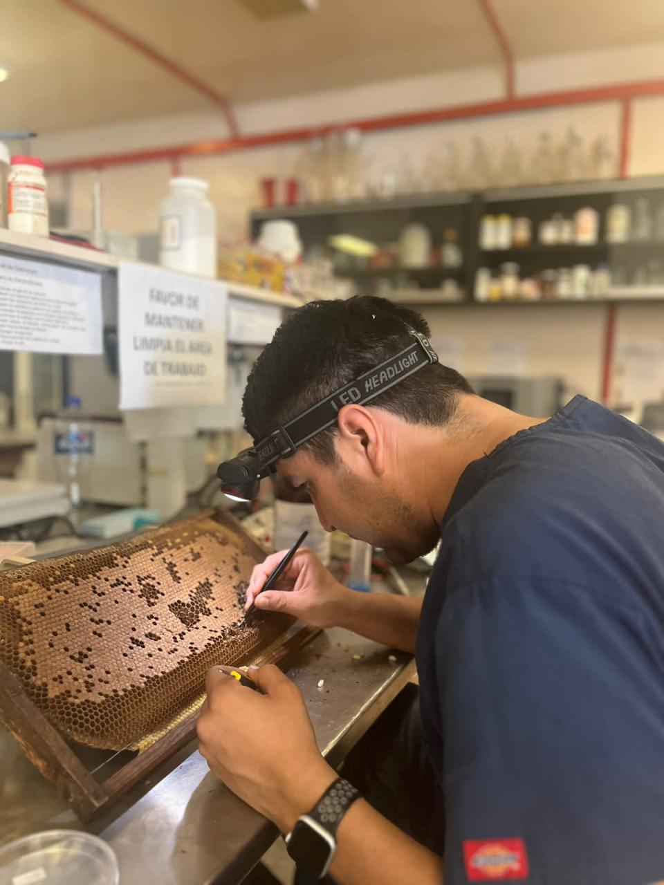 Al respecto, el Mtro. Jesús Humberto Reyna Flores, estudiante del Doctorado en Ciencias en Sanidad y Producción Animal de la Facultad de Medicina Veterinaria y Zootecnia (FMVZ-UAT), explicó que la investigación busca encontrar un método natural para atacar esa enfermedad que es causada por el ácaro “Varroa destructor” que afecta a las abejas obreras, reinas y zánganos.