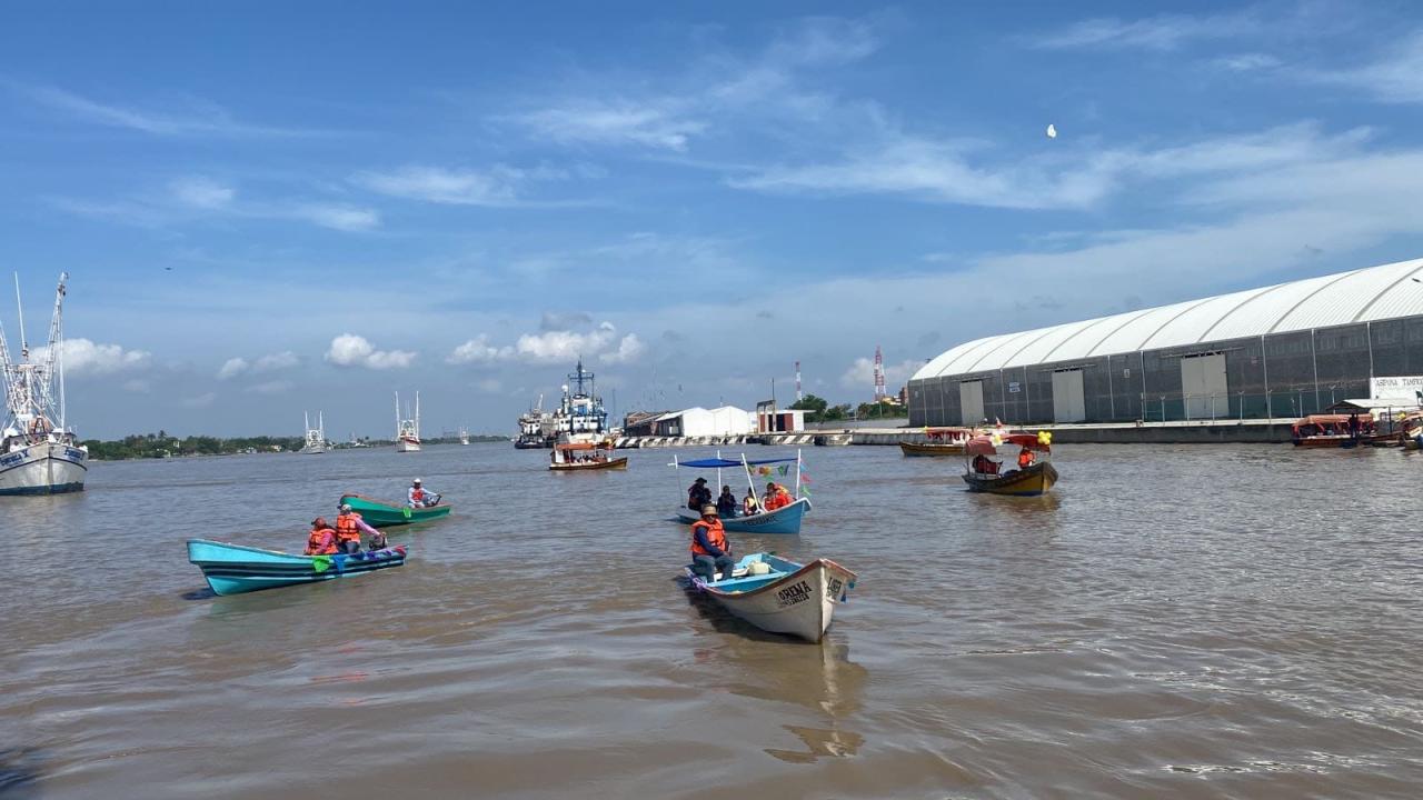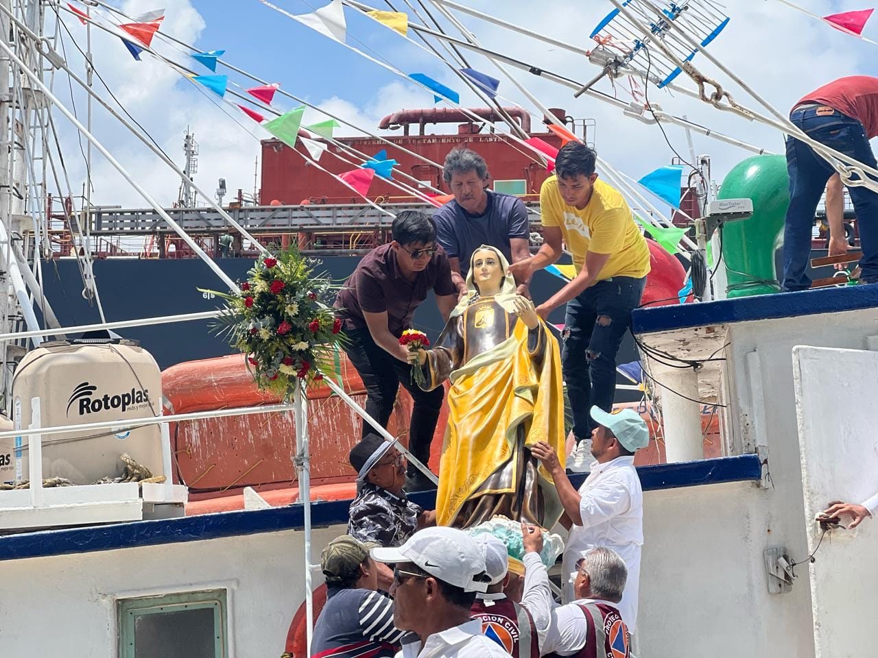 A su paso se fueron sumando lanchas y botes, mientras que en los costados de la travesía, danzantes con sus coloridos vestuarios, cantaban y bailaban a la Patrona de Los Pescadores.