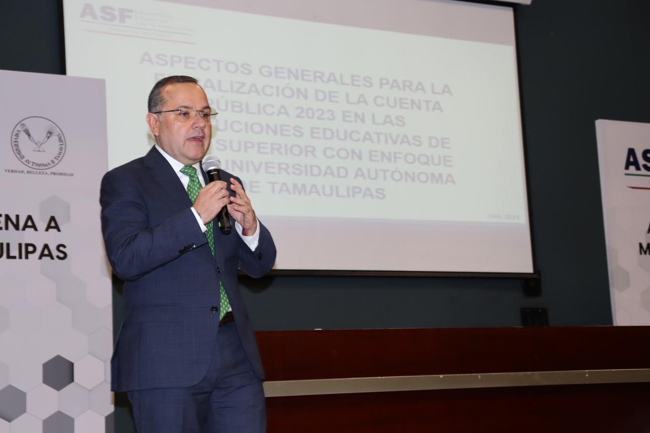 El curso fue impartido en el Campus Tampico por el Mtro. José Arturo Lozano Enríquez, director general de Auditoría del Gasto Federalizado “A” de la ASF, con la asistencia del rector de la UAT, MVZ Dámaso Anaya Alvarado, titulares del gabinete de la Rectoría y directores de facultades y unidades académicas de la máxima casa de estudios del estado.