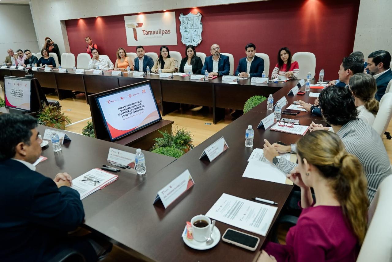 Ciudad Victoria, Tamaulipas.- Para beneficiar a las pequeñas y medianas empresas (Pymes) tamaulipecas con financiamiento en condiciones preferenciales y brindarles acompañamiento y capacitación, la Secretaría de Economía y Banco Santander México firmaron un convenio de colaboración.