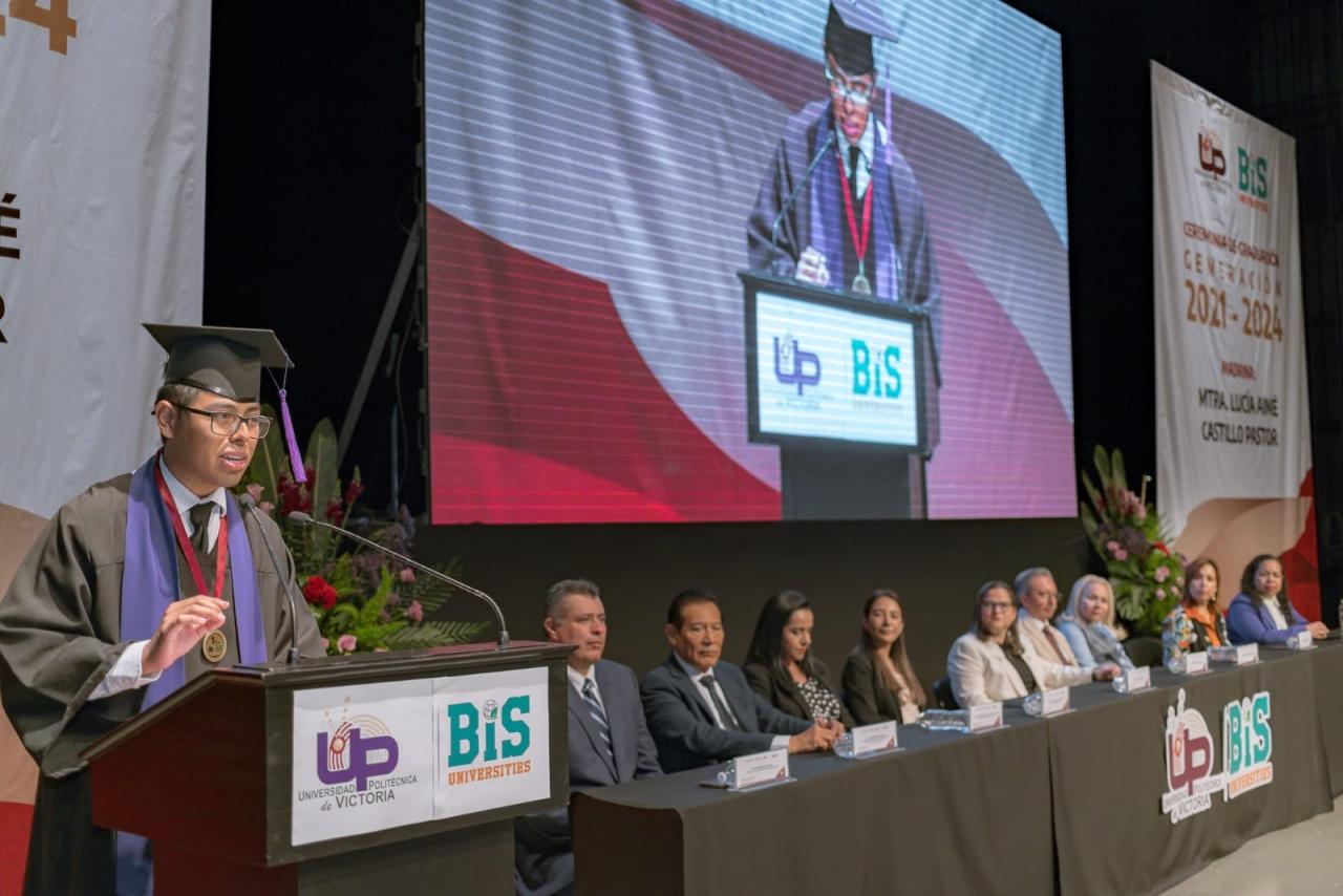 Estuvieron presentes en la ceremonia de graduación, Abril Alejandra Ramírez Erazo, secretaria académica y encargada de la Rectoría de la Universidad Politécnica de Victoria; Guadalupe Acosta Villarreal, subsecretario de Educación Media Superior y Superior; Nora Hilda de los Reyes Vázquez, titular de la Oficina de Enlace Educativo en Tamaulipas; María Guadalupe Samantha Montiel Orduño, titular de la Oficina Estatal de la Dirección General de Educación Tecnológica Agropecuaria y Ciencias del Mar; Olegario Muñiz Cura, titular de la Oficina Estatal de la Dirección General de Educación Tecnológica y Servicios; Amelia Castillo Moran, rectora del Centro Regional de Formación Docente e Investigación Educativa; Claudia Anaya Alvarado, directora general del Instituto Tamaulipeco de Capacitación para el Empleo, así como rectores de las Universidades Tecnológicas y Politécnicas de Tamaulipas, entre otras autoridades estatales y municipales.